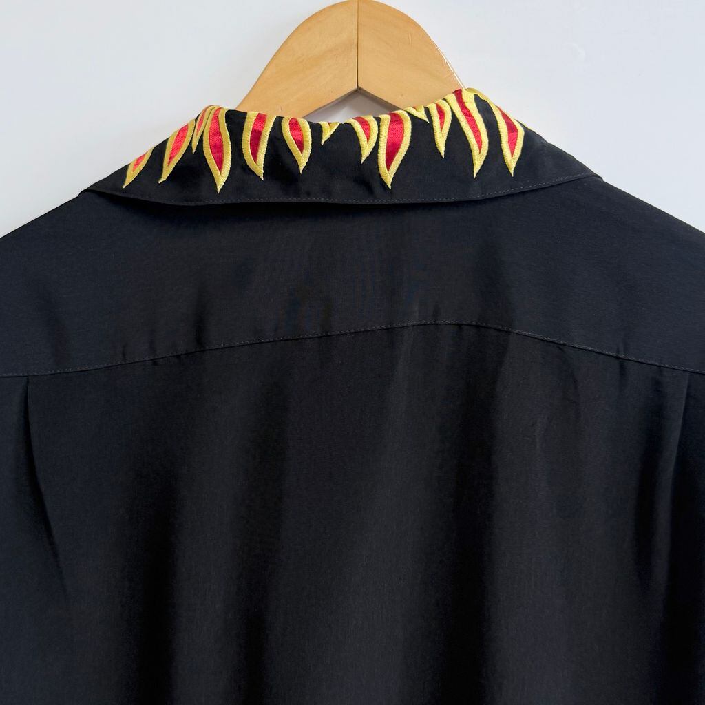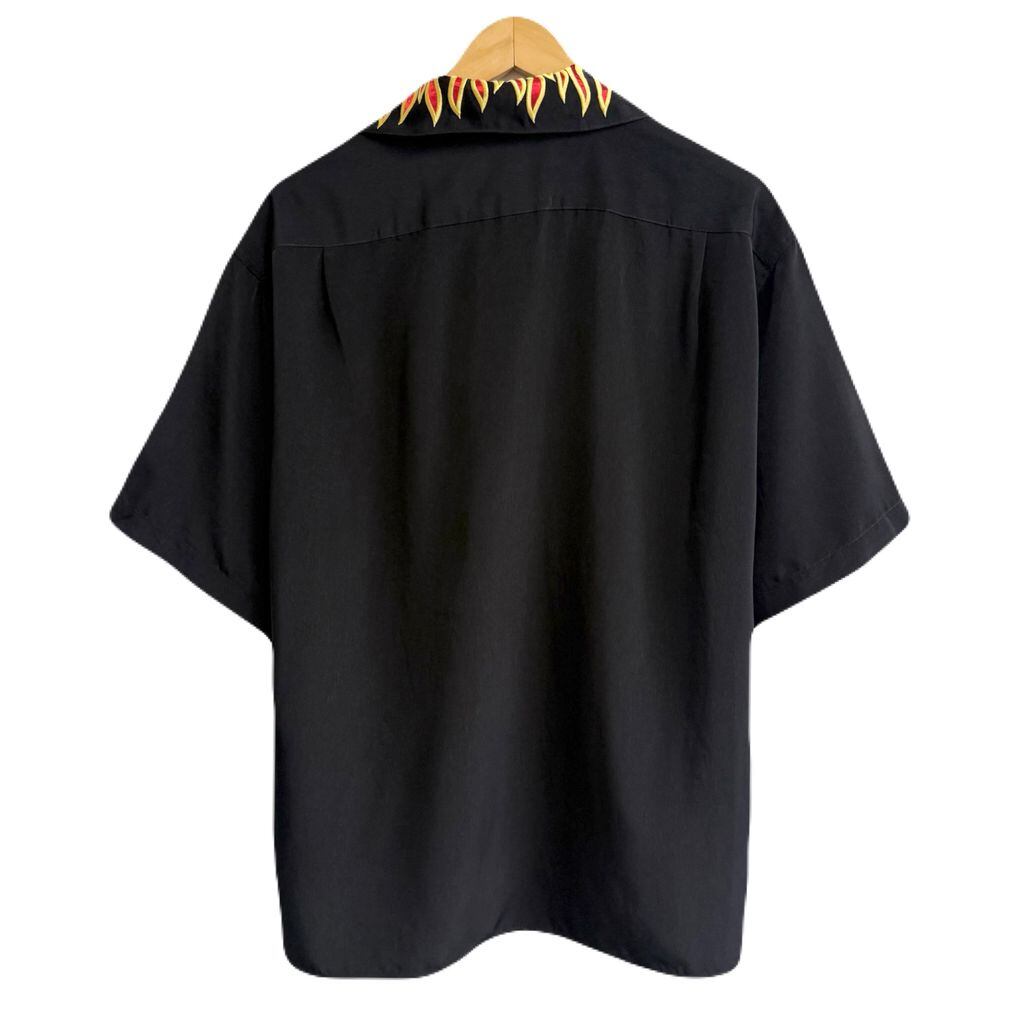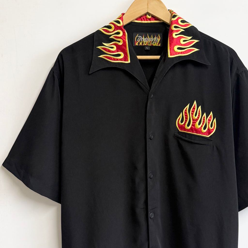 Dragonfly ファイヤーパターン 炎 刺繍 チカーノシャツ バイカースタイル オープンカラー 開襟シャツ 半袖シャツ 黒×黄色×赤 Lサイズ No.M529