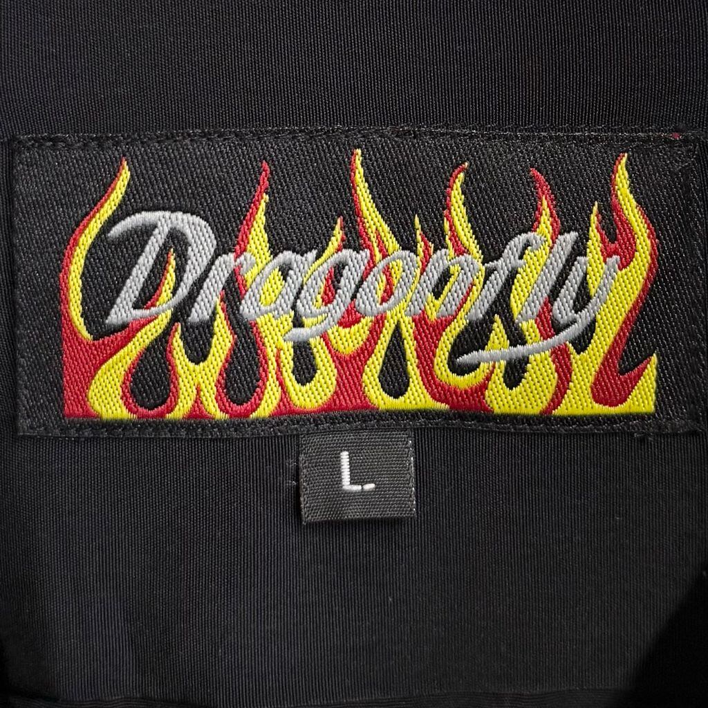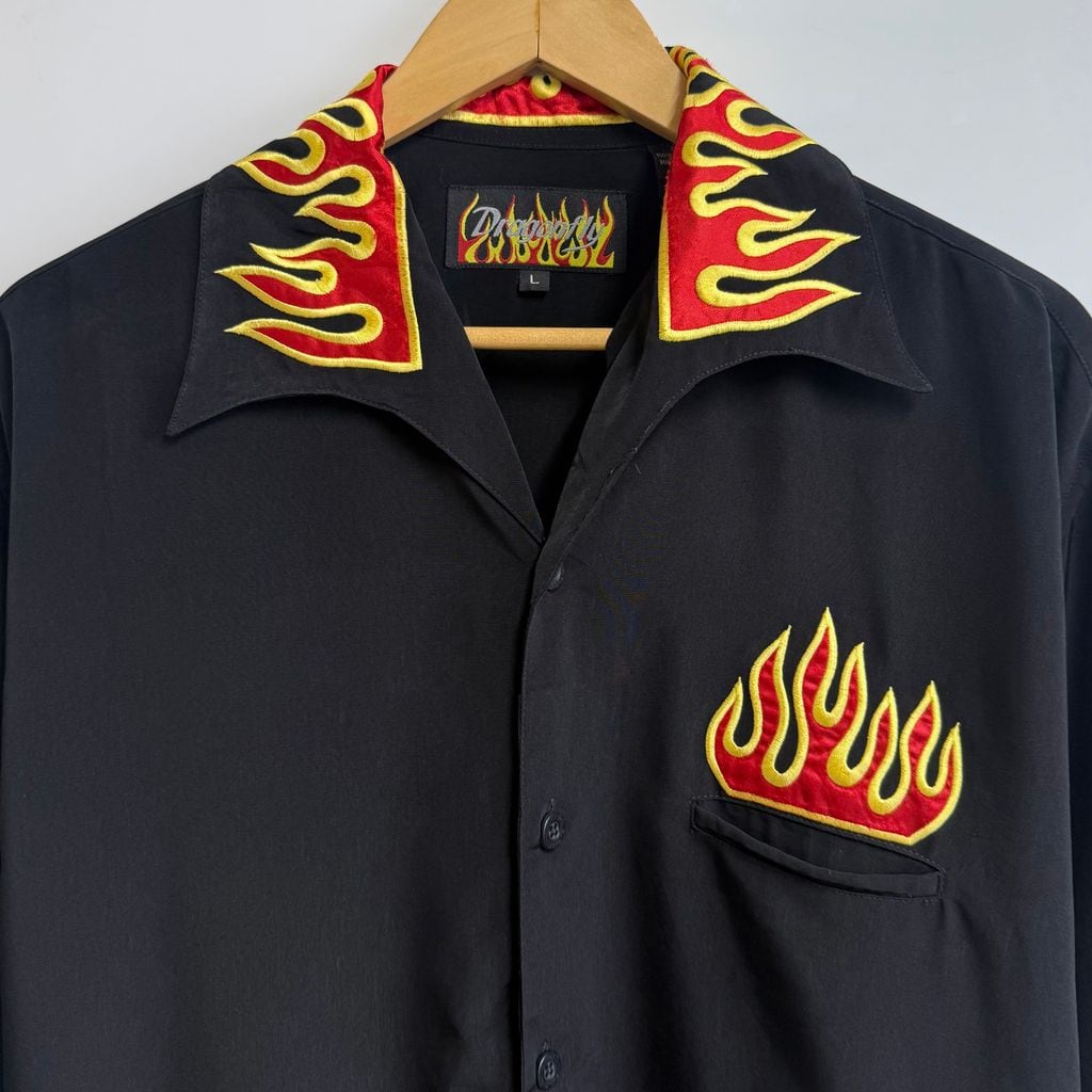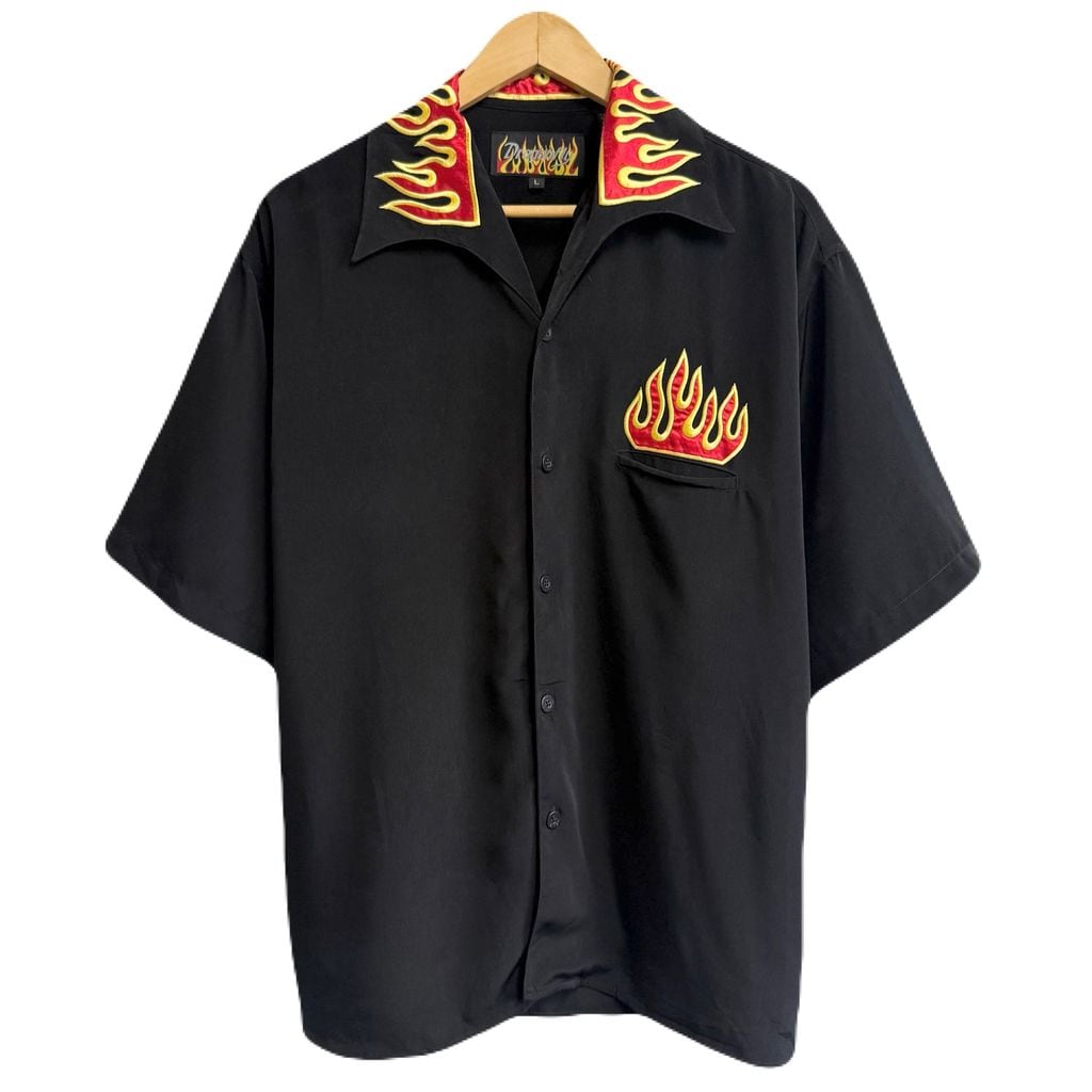 Dragonfly ファイヤーパターン 炎 刺繍 チカーノシャツ バイカースタイル オープンカラー 開襟シャツ 半袖シャツ 黒×黄色×赤 Lサイズ No.M529