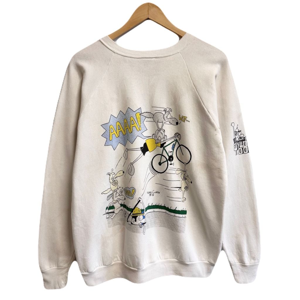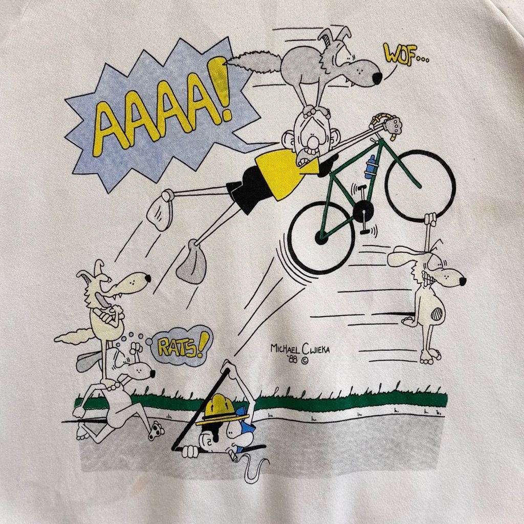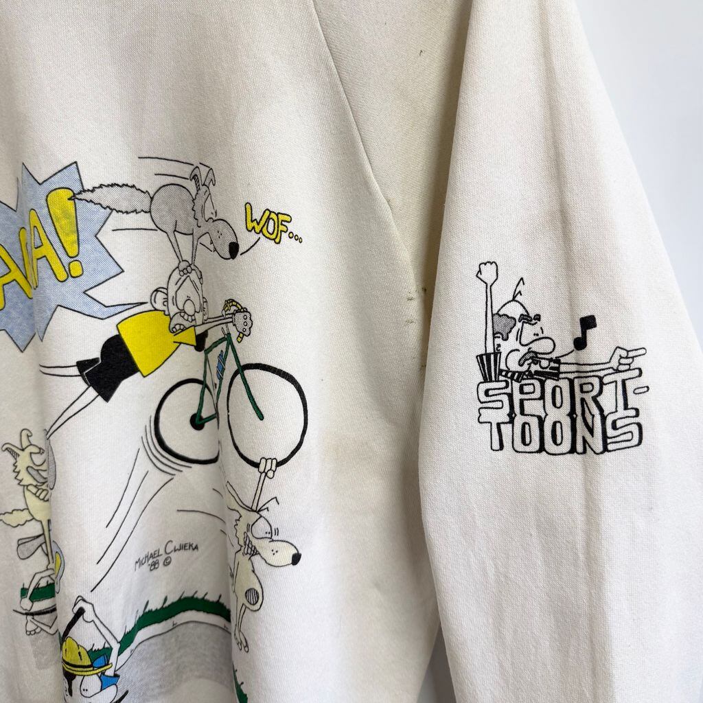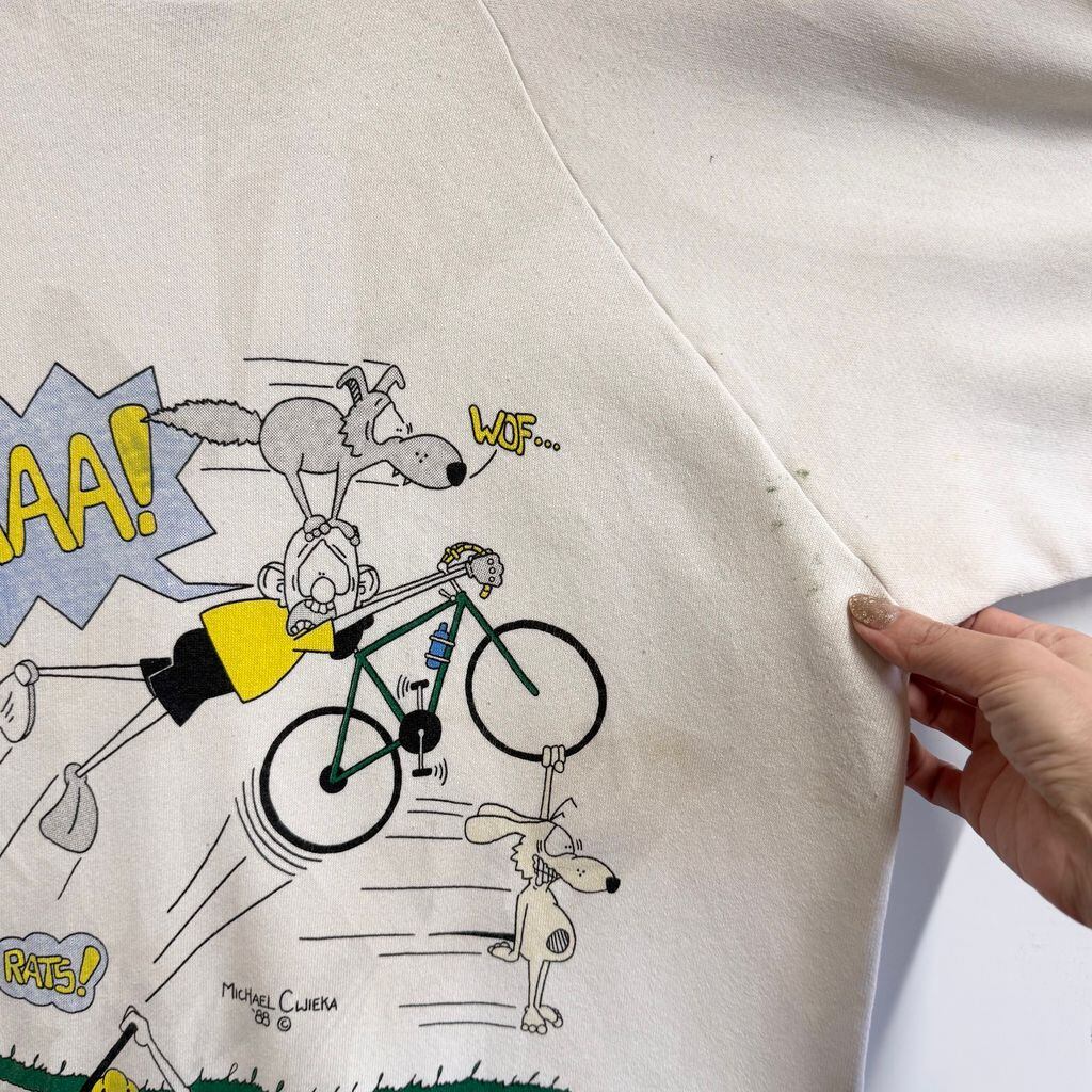 80's USA製 FRUIT OF THE LOOM フルーツオブザルーム Sport Toons マイケル クウィーカ サイクリング イラスト キャラクター ラグランスウェット トレーナー 白 XLサイズ No.M634