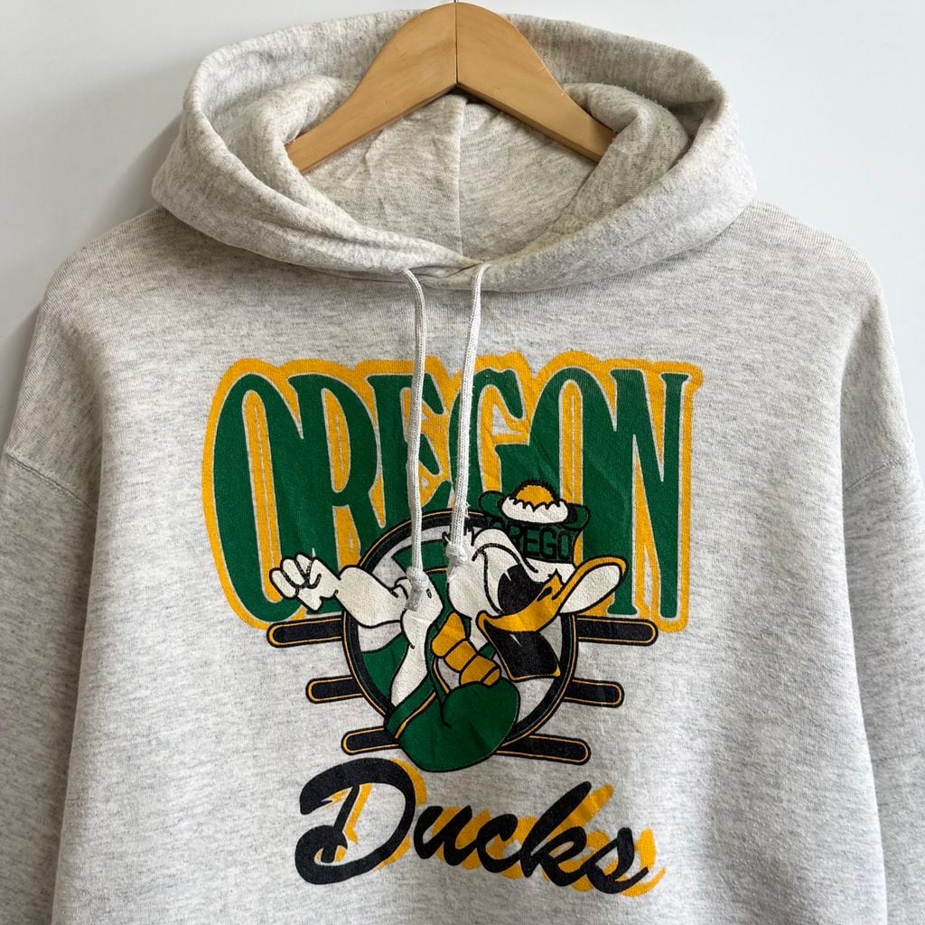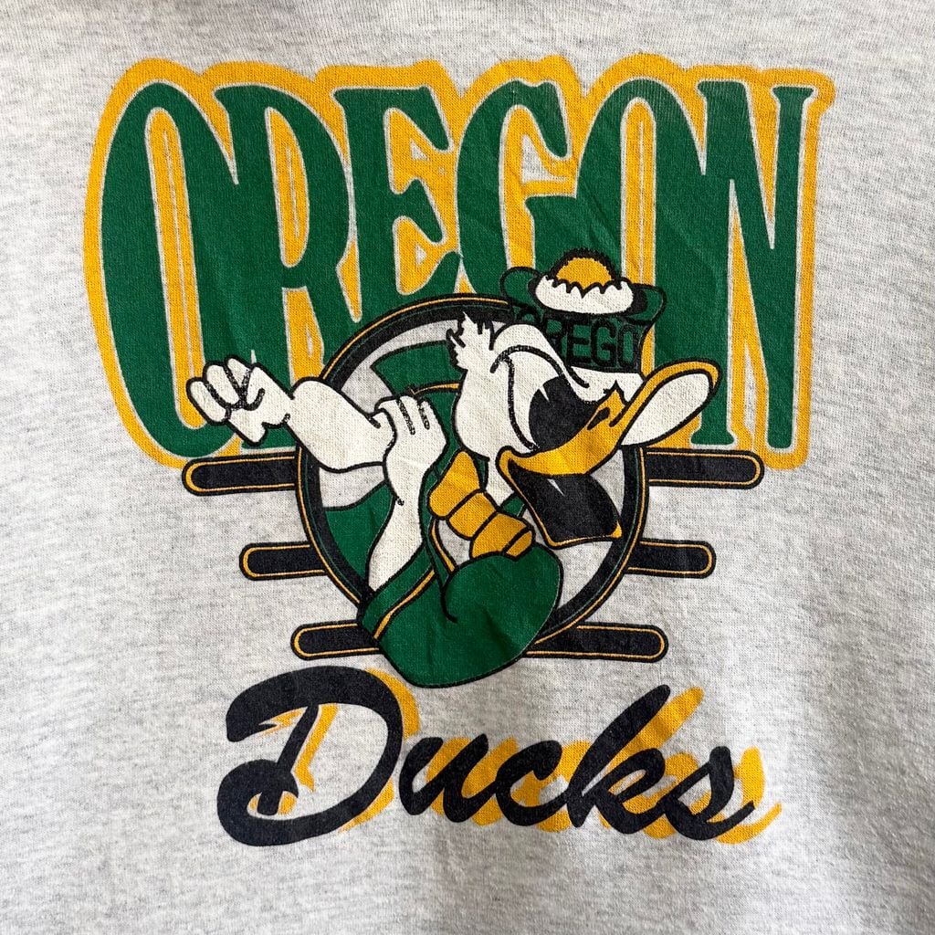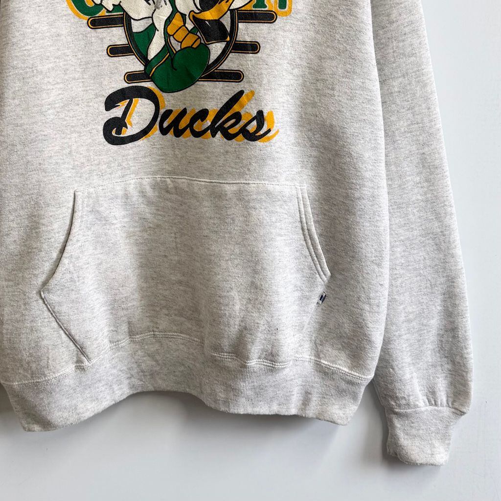 90's USA製 RUSSELL ATHLETIC ラッセルアスレティック オレゴン・ダックス カレッジ ドナルドダック フーディー パーカー ポケット付き 裏起毛 ライトグレー Lサイズ No.M704