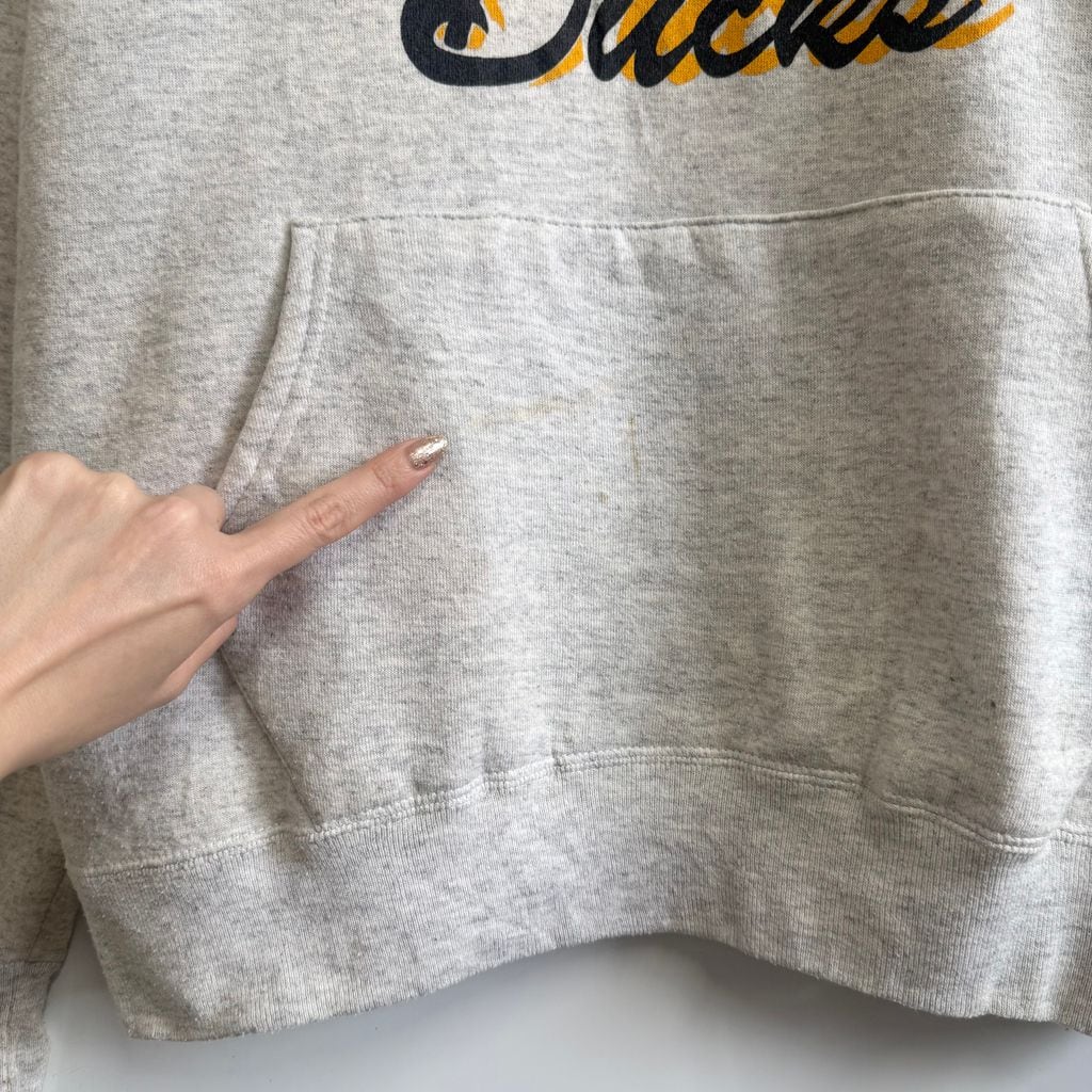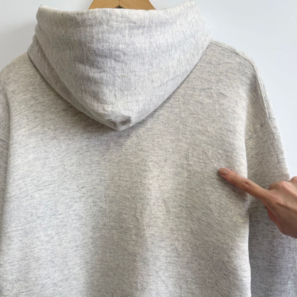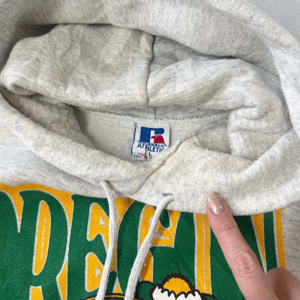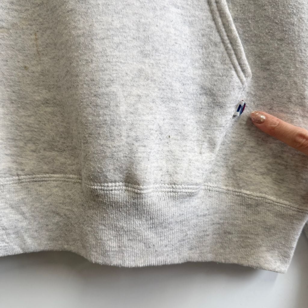 90's USA製 RUSSELL ATHLETIC ラッセルアスレティック オレゴン・ダックス カレッジ ドナルドダック フーディー パーカー ポケット付き 裏起毛 ライトグレー Lサイズ No.M704