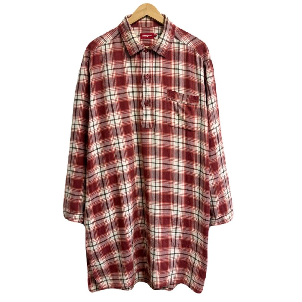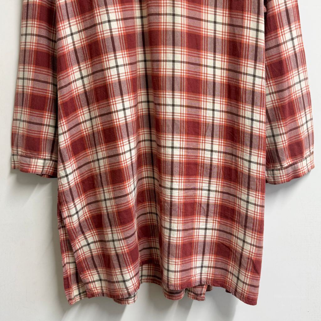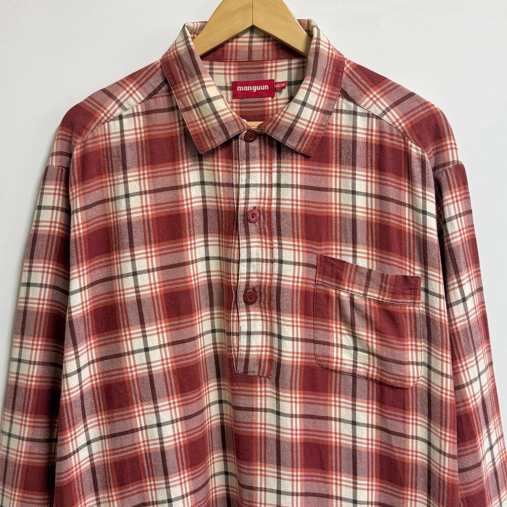 manguun グランパシャツ プルオーバーシャツ ロングシャツ チェック柄 白×赤×オレンジ×茶色 No.M734