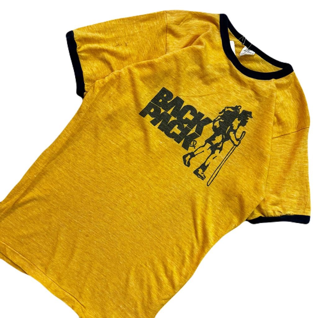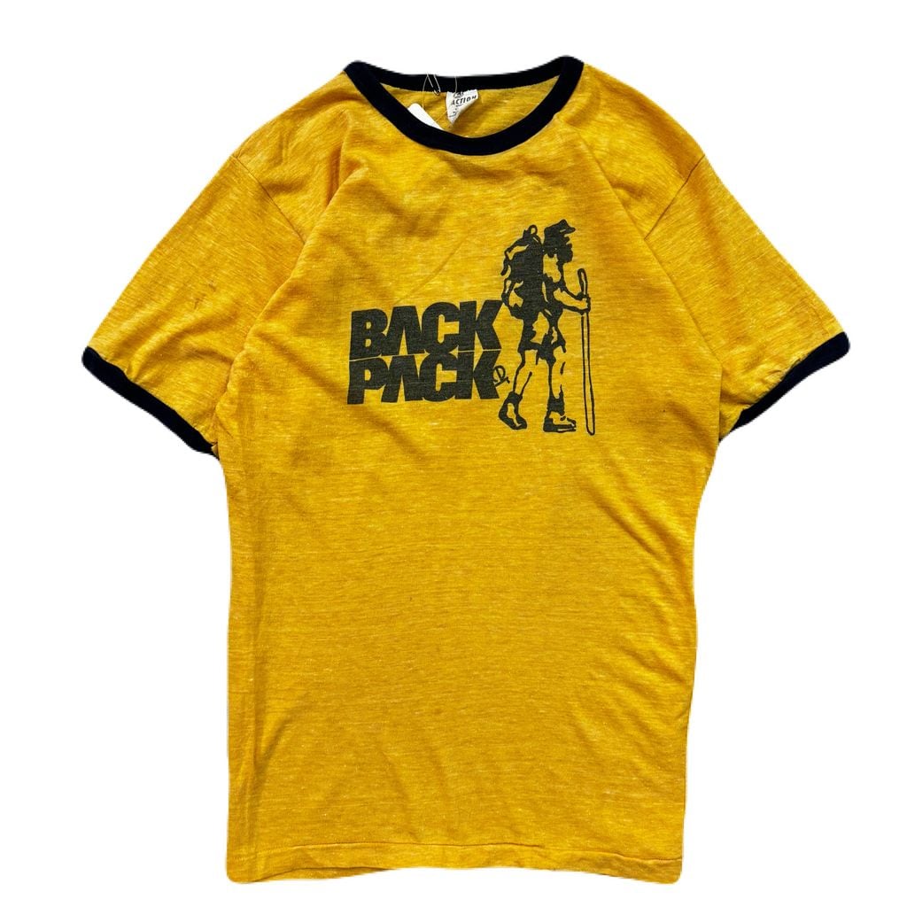 70s~ ACTION vintage BACK PACK アクション バックパック リンガーTシャツ リンガー イエロー×ネイビー Lサイズ No.EA248