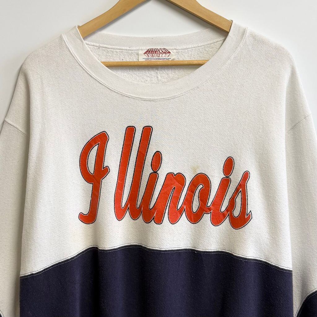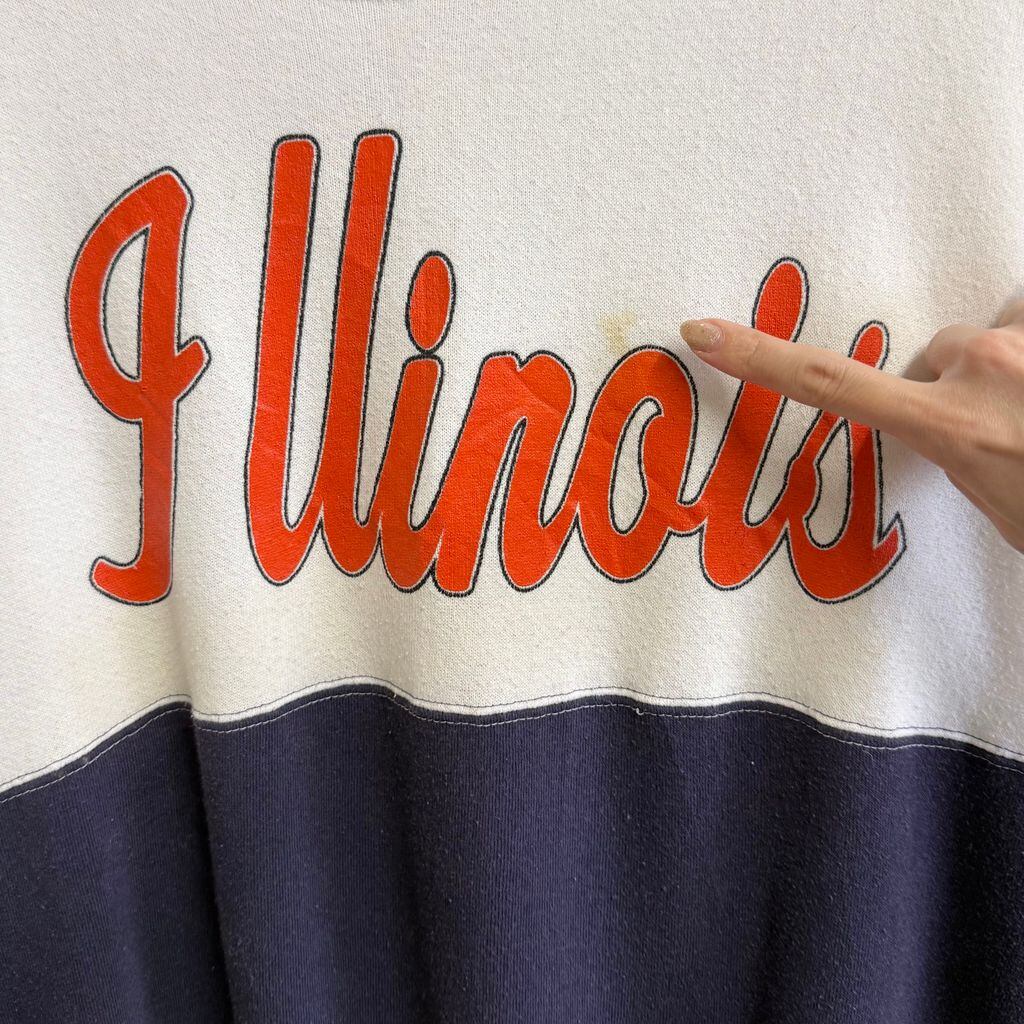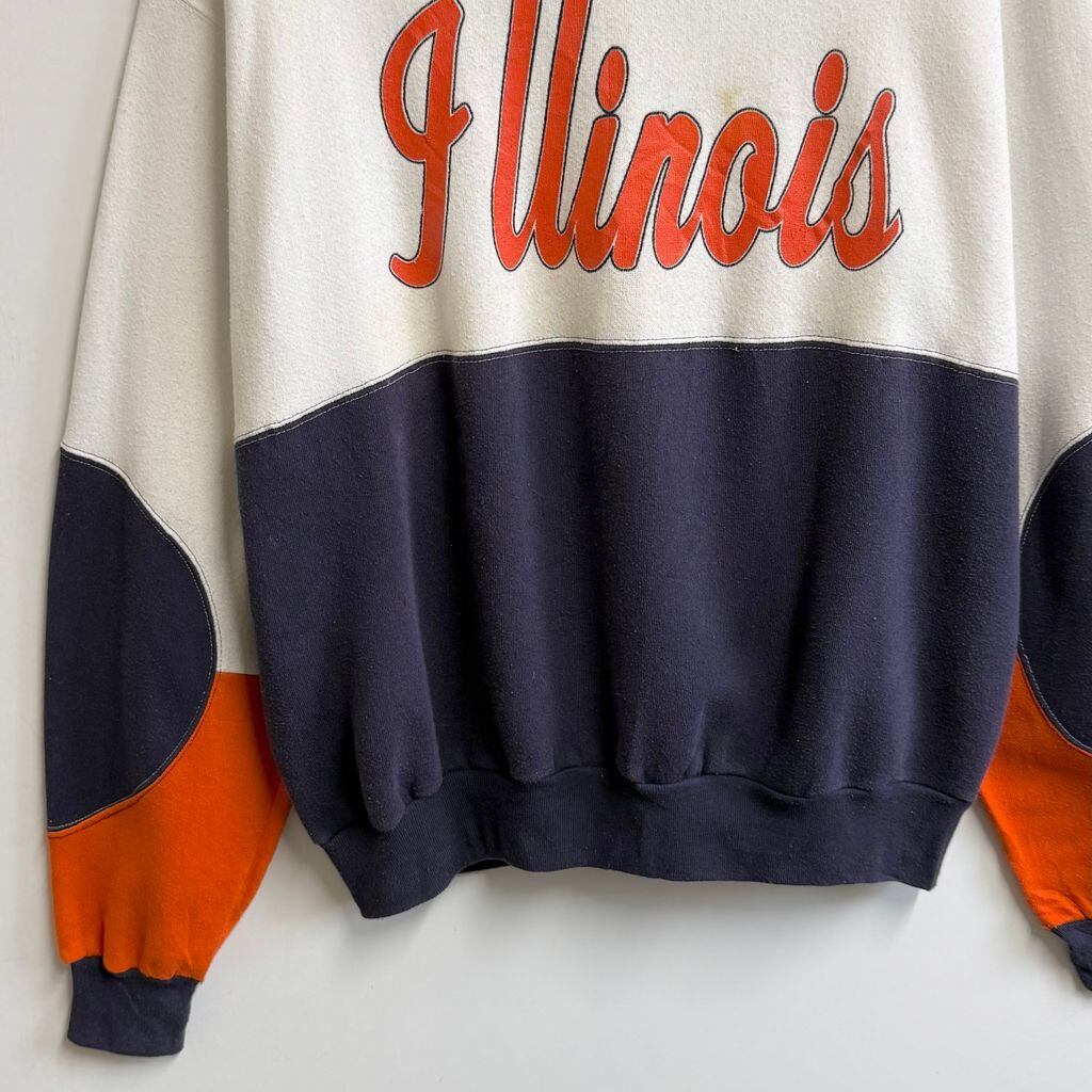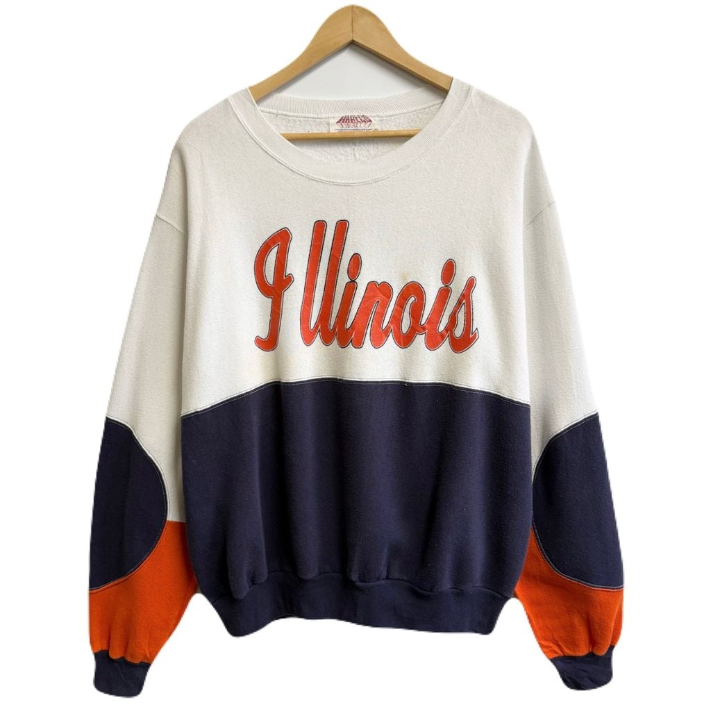 〜80's vintage ビンテージ USA製 HARLCO フロントプリント ILLINOIS イリノイ カレッジロゴ マルチカラー トレーナー スウェット 裏起毛 白×紺×オレンジ XLサイズ No.M787