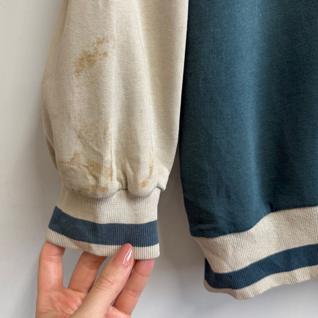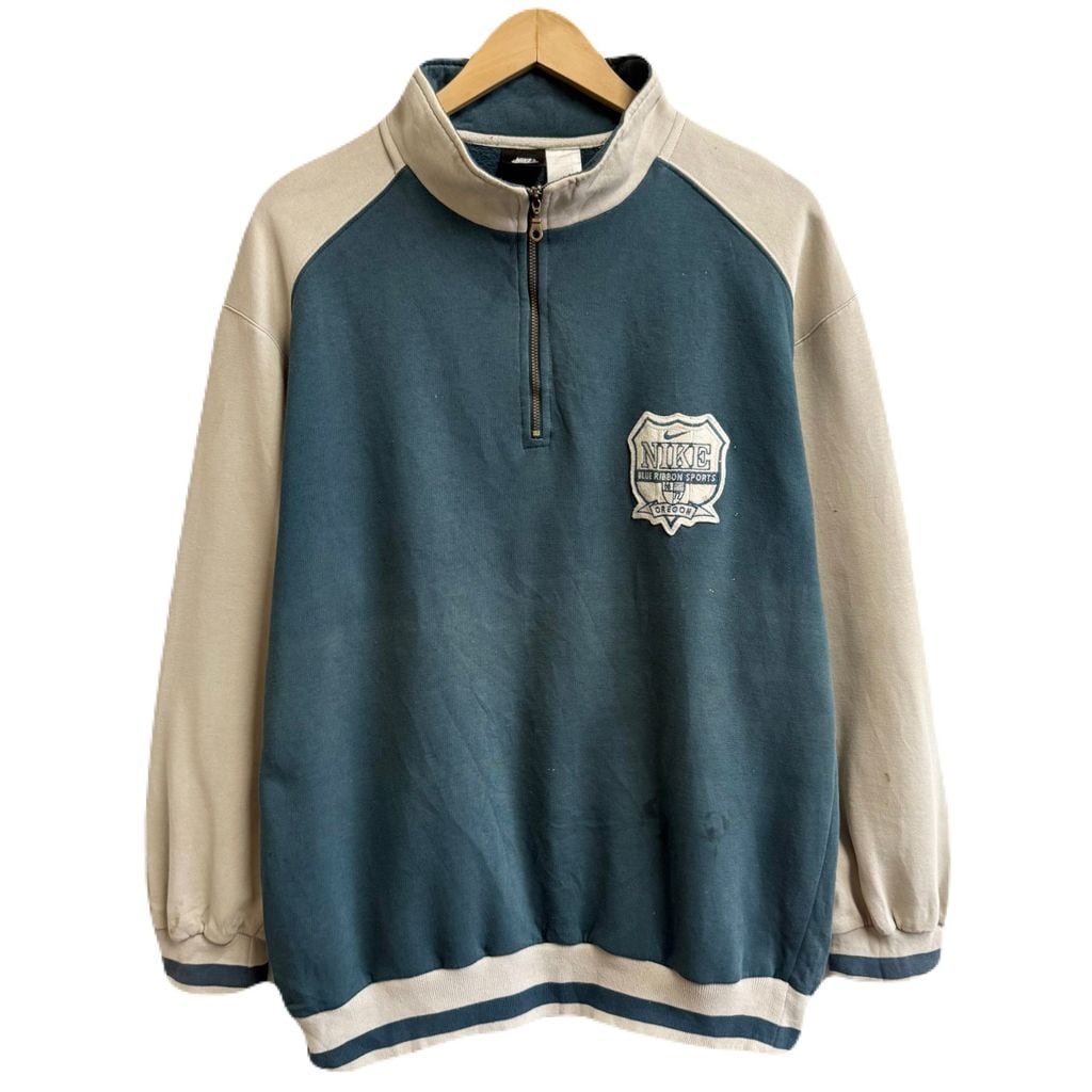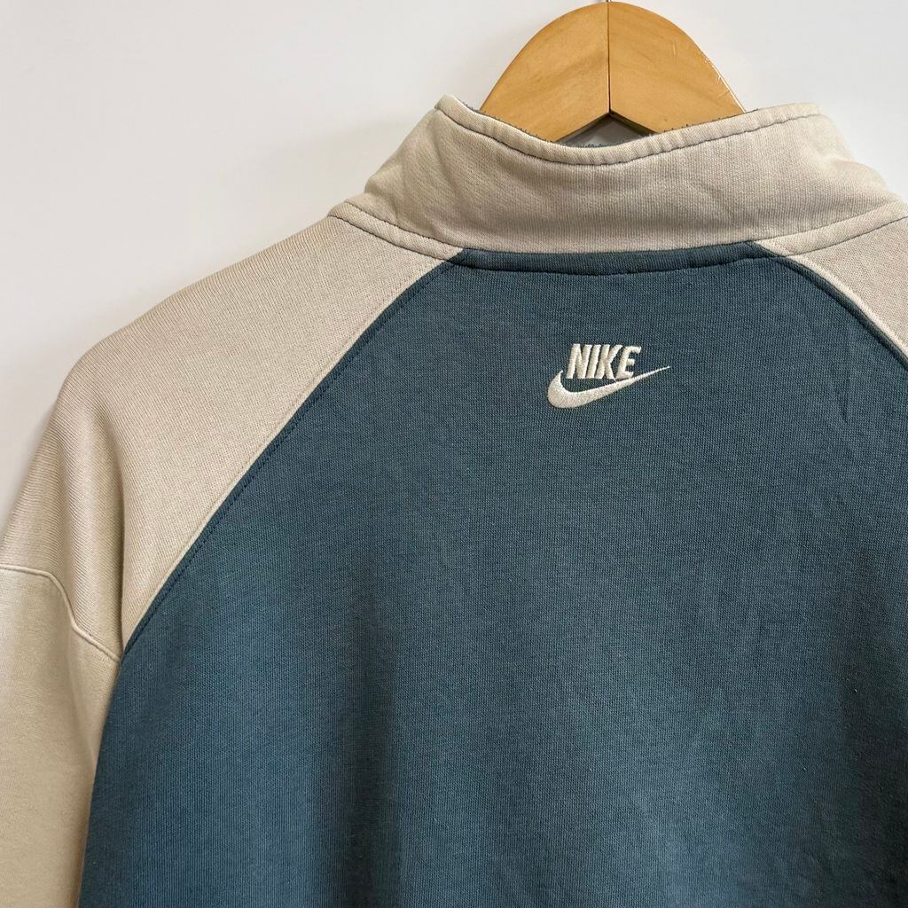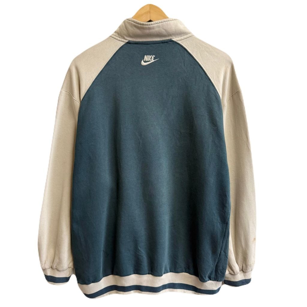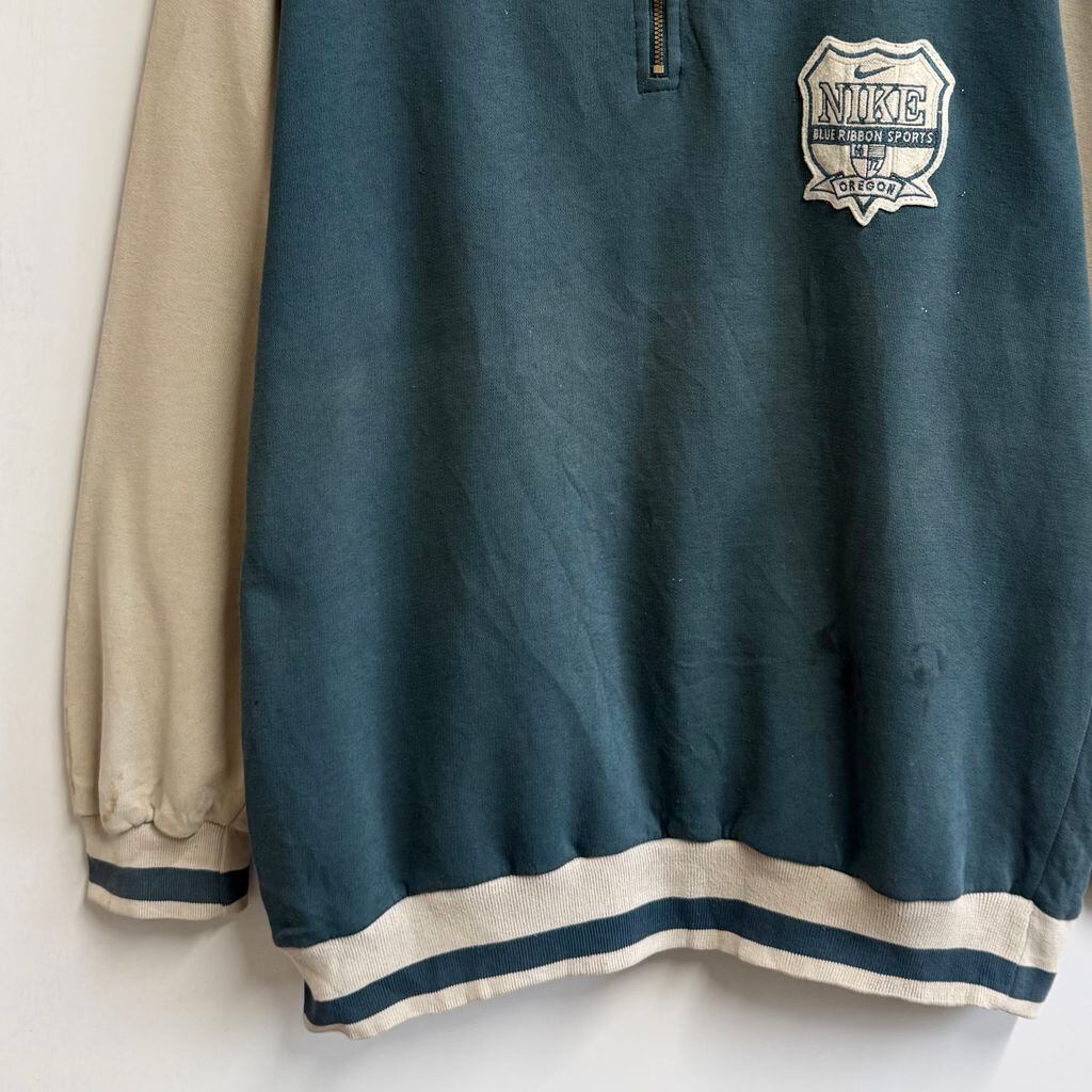 NIKE ナイキ ハーフジップスウェットシャツ プルオーバー ロゴワッペン バイカラー ベージュ×ブルーグリーン Lサイズ No.M789