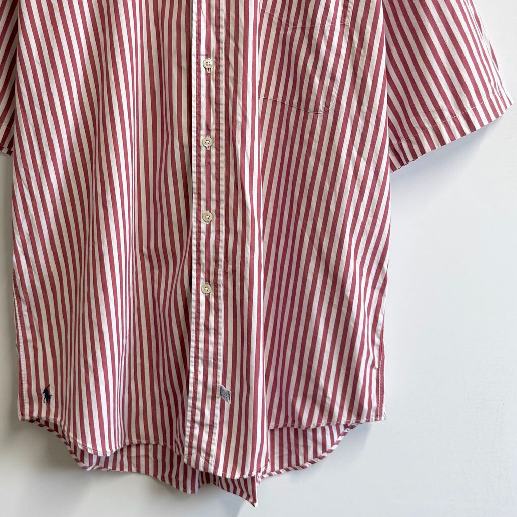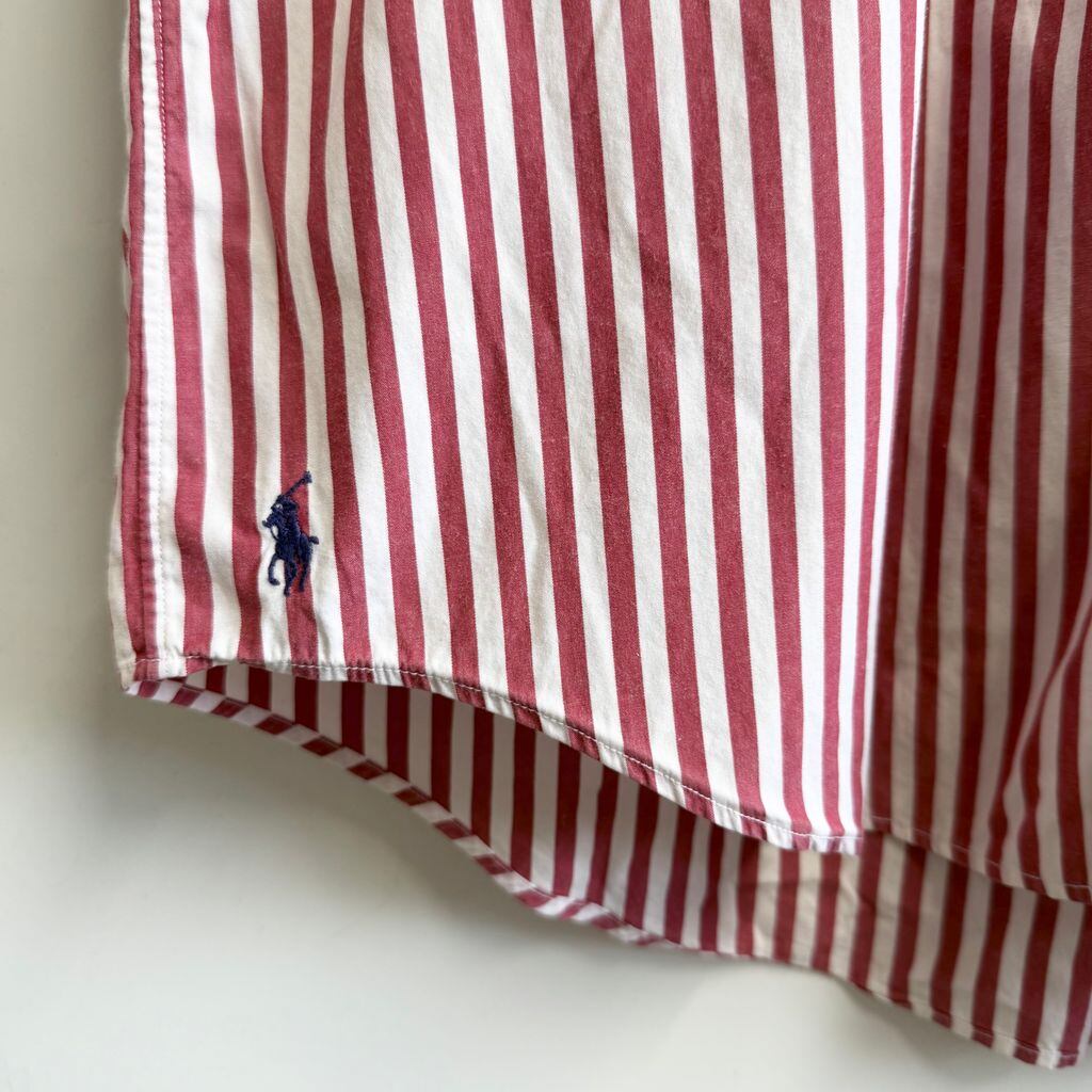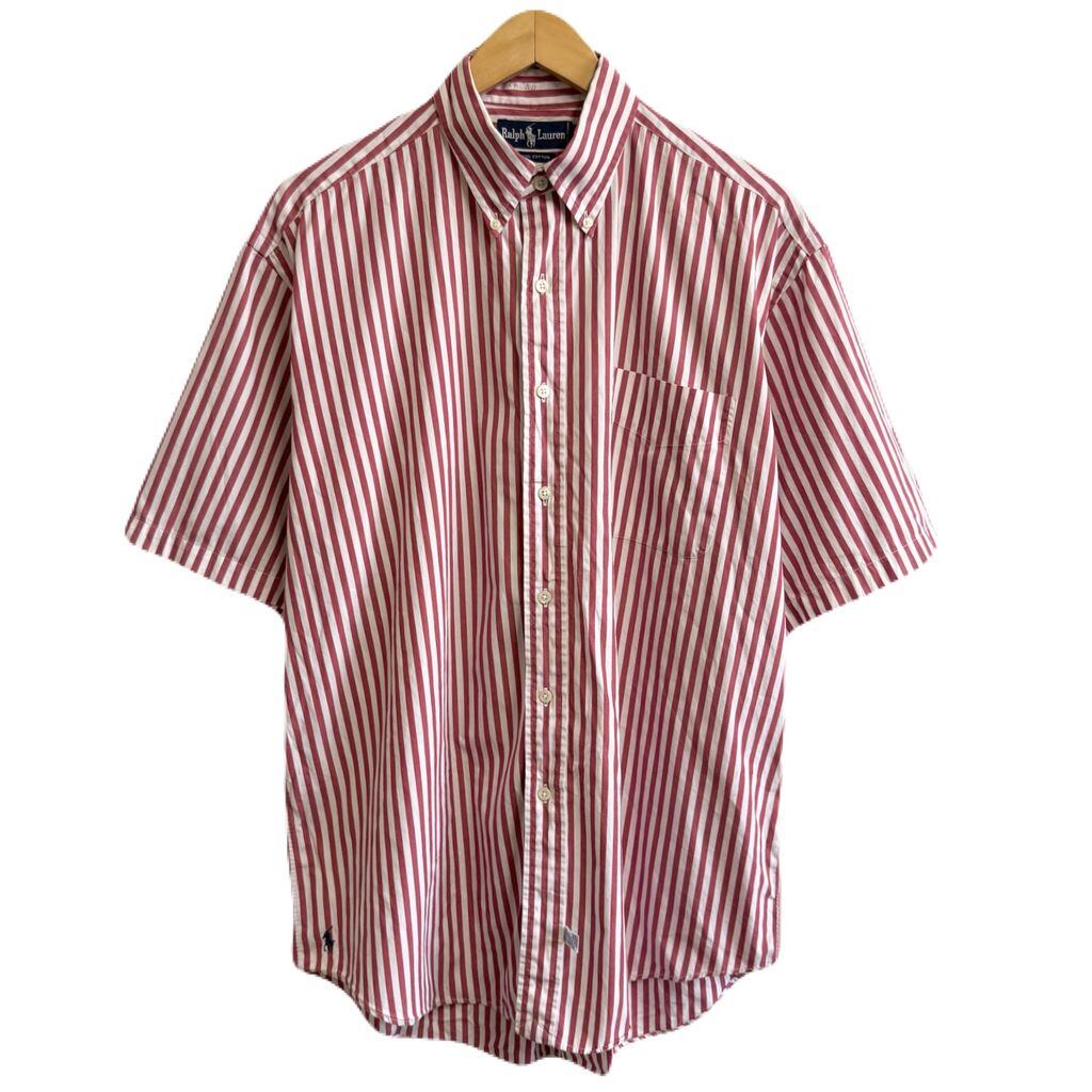Ralph Lauren ラルフローレン ボタンダウンシャツ コットンシャツ ストライプ ポケット付き 半袖シャツ ワンポイントロゴ 刺繍 赤×白 Lサイズ No.M867