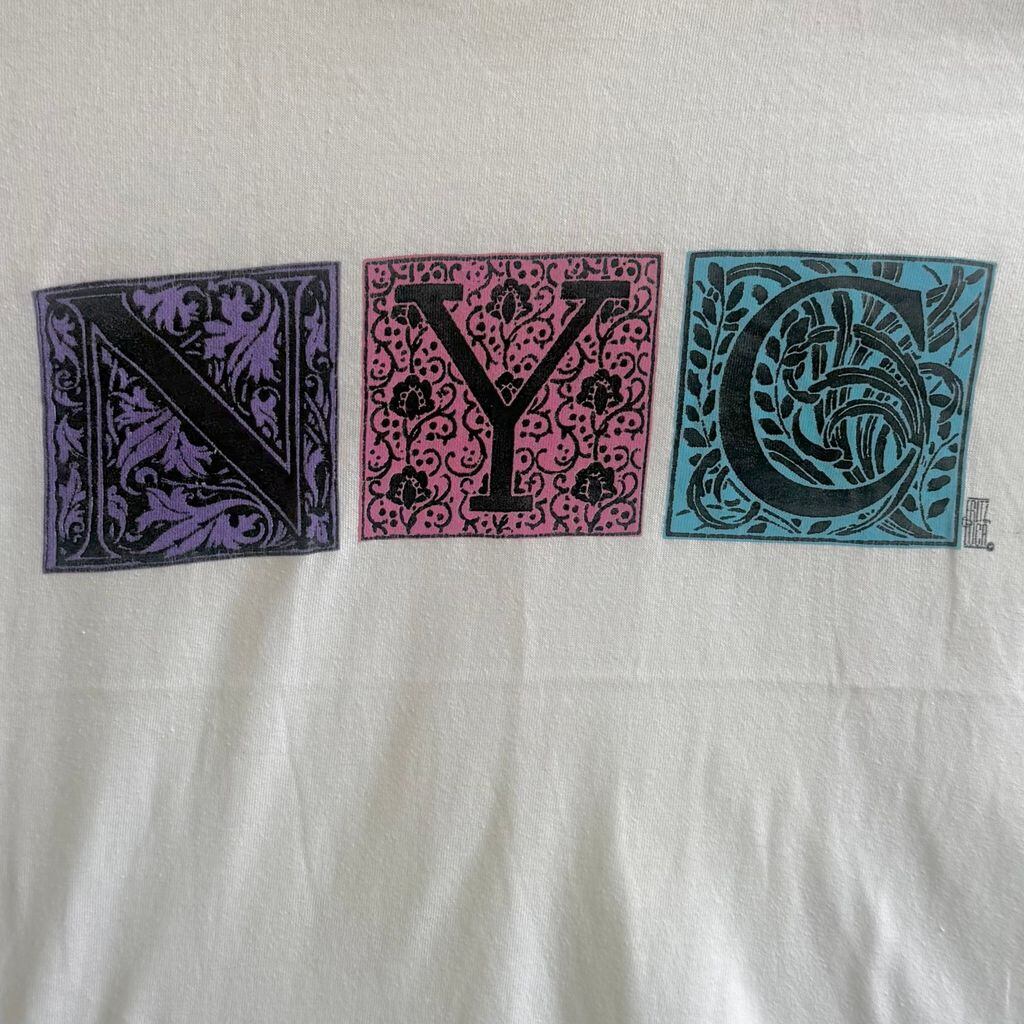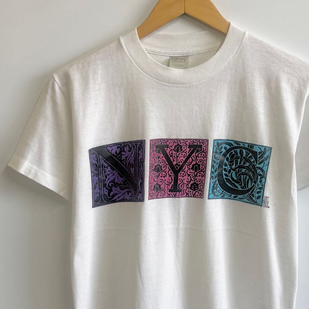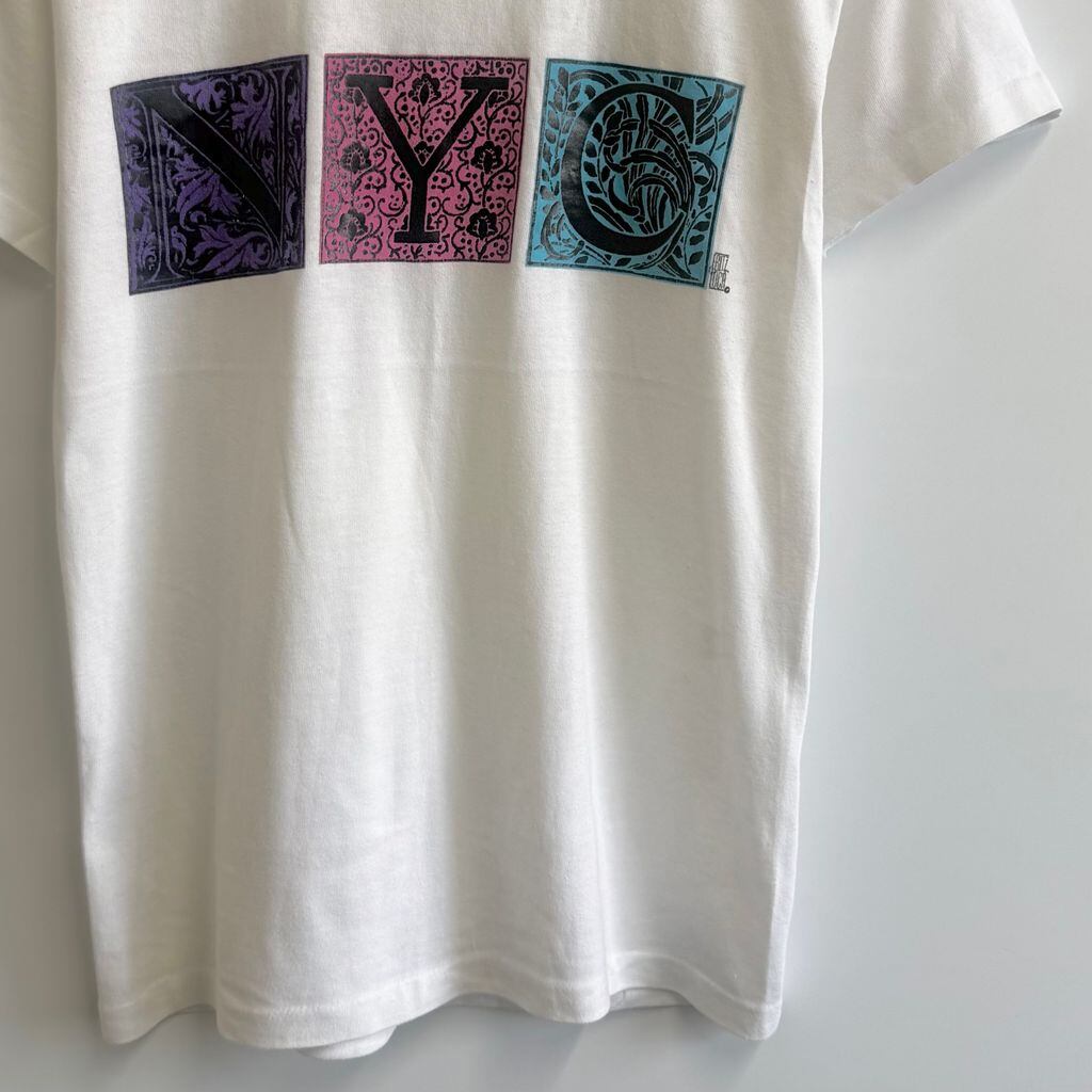 80's〜 vintage ビンテージ USA製 Tect フロントプリント NYC 装飾文字 イニシャルドロップキャップ シングルステッチ 半袖Tシャツ 白 Sサイズ No.M885
