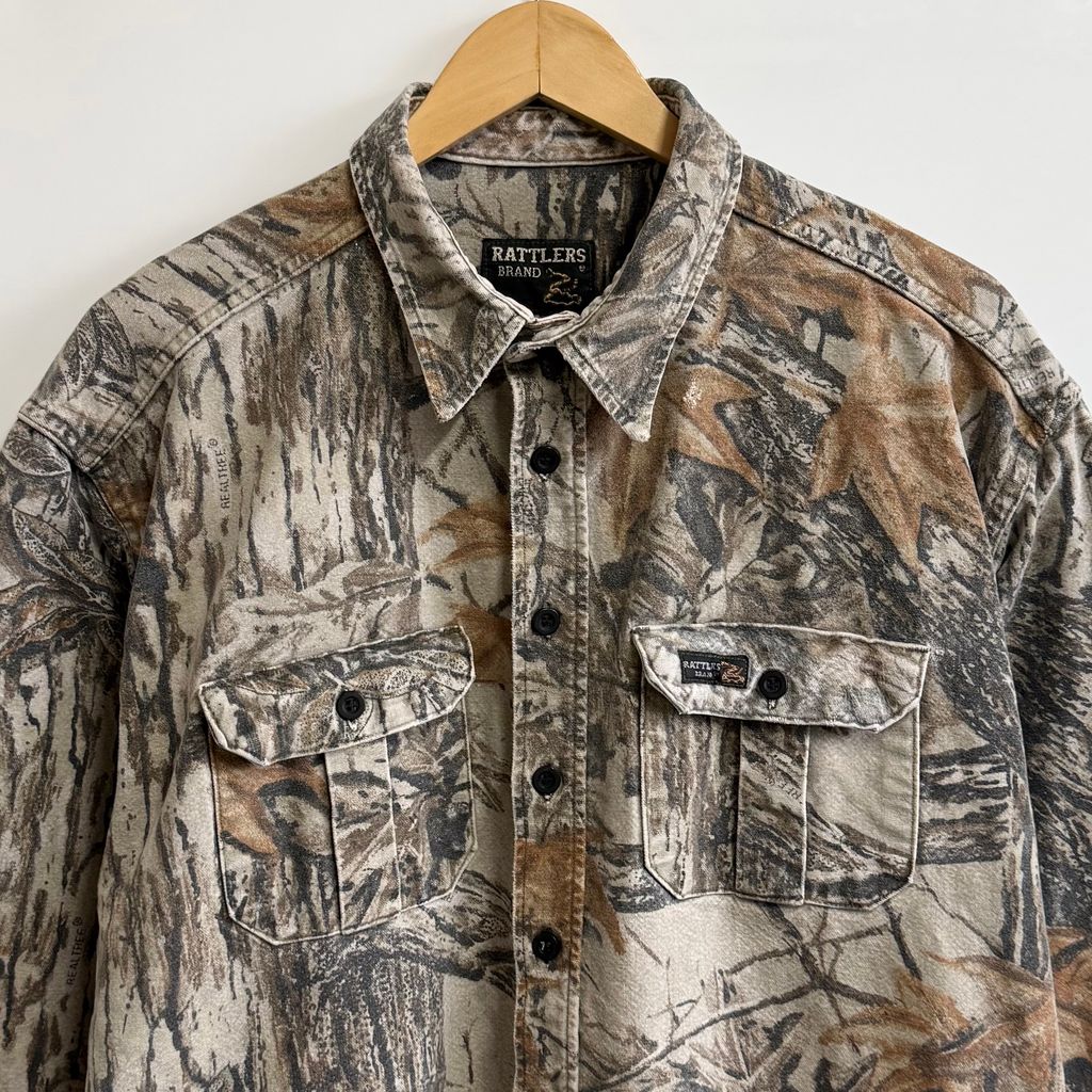 USA製 RATTLERS BRAND リアルツリーカモ 総柄 柄シャツ 長袖シャツ ライトグレー×多色 No.M910