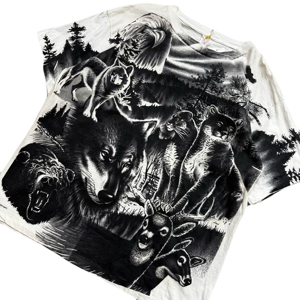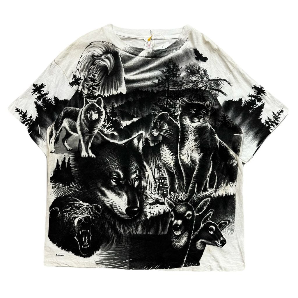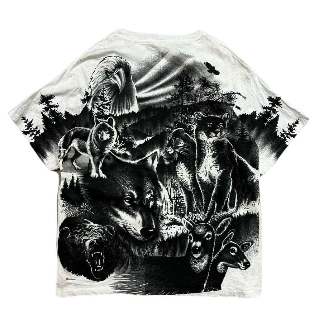 ~90s BUCKS 動物 総柄 モノトーン アニマル 両面プリント アートプリント Tシャツ 白×黒 Lサイズ No.EA277