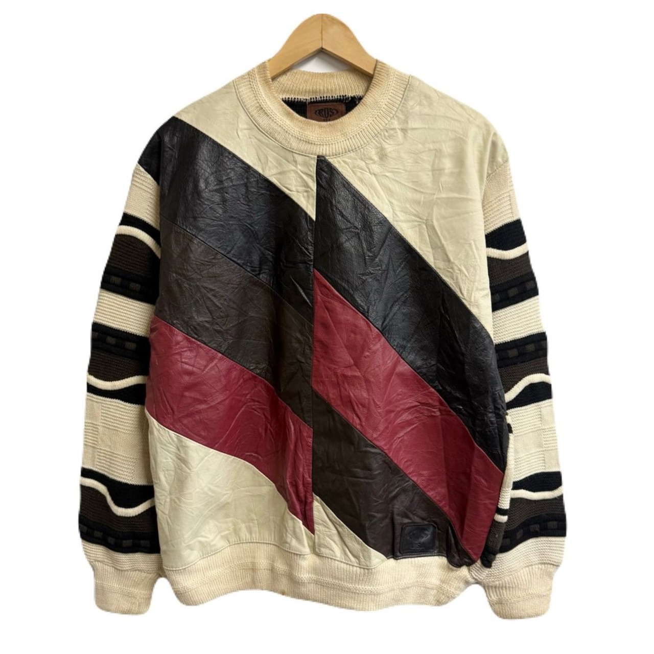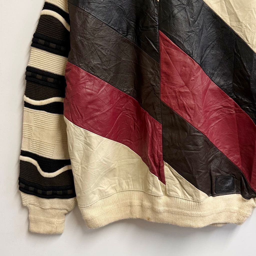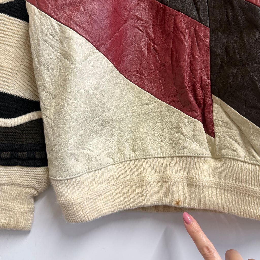 TRUST 切り替えデザイン 本革×アクリル レザーフロントセーター 3Dニット 白×黒×赤×茶 Mサイズ No.P070