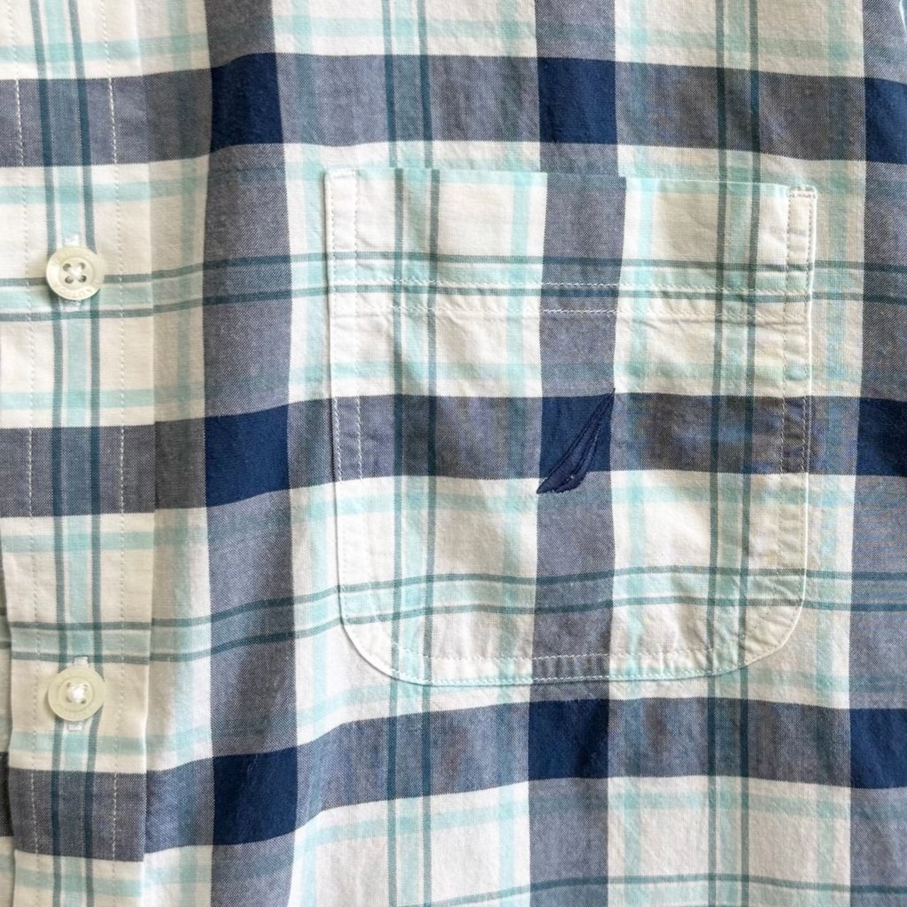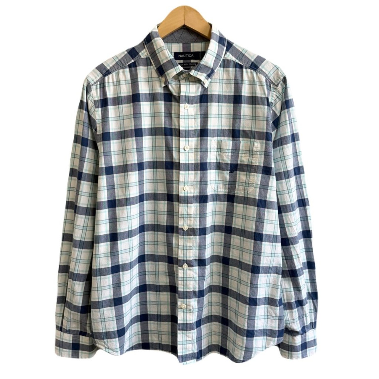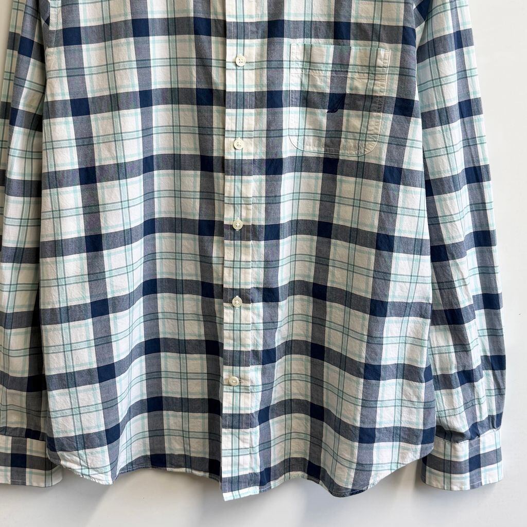 NAUTICA ノーティカ CLASSIC FIT ボタンダウンシャツ チェック柄 ポケット付き 長袖シャツ ワンポイントロゴ 刺繍 白×紺×水色×グリーン Lサイズ No.P105