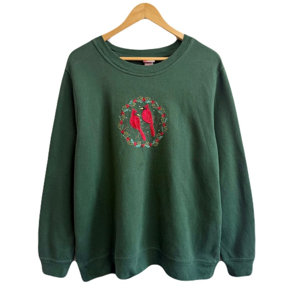 HOLIDAY EDITIONS 鳥 カージナル リース クリスマス 刺繍 トレーナー スウェット 裏起毛 緑 グリーン XLサイズ No.P294
