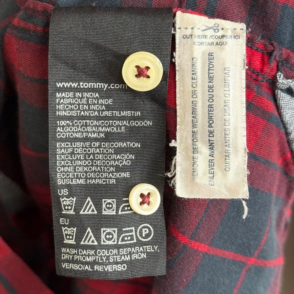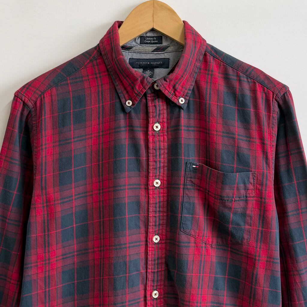 TOMMY HILFIGER トミーヒルフィガー ボタンダウンシャツ コットンシャツ チェック柄 ポケット付き 長袖シャツ ワンポイントロゴ 刺繍 赤×紺 Mサイズ No.P311