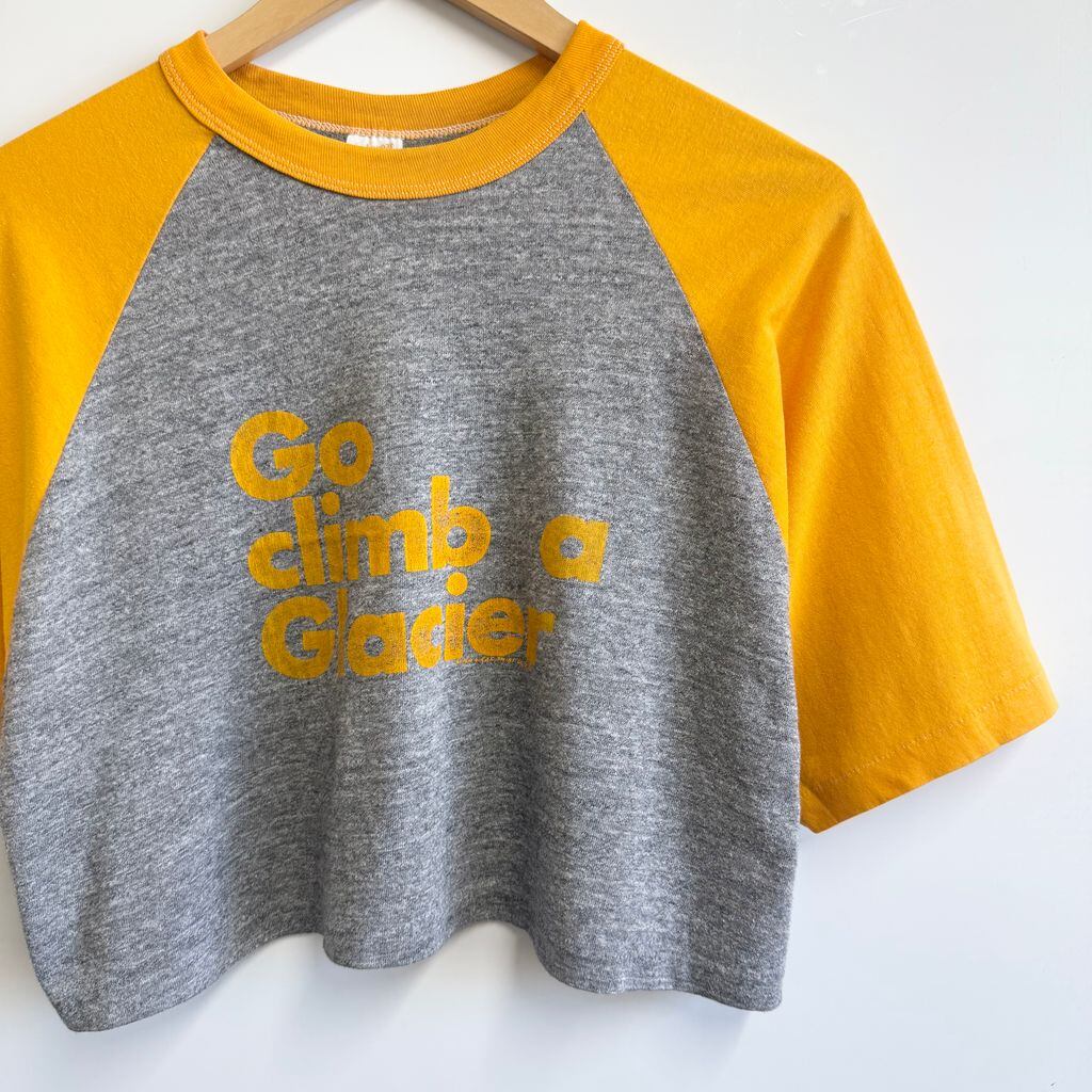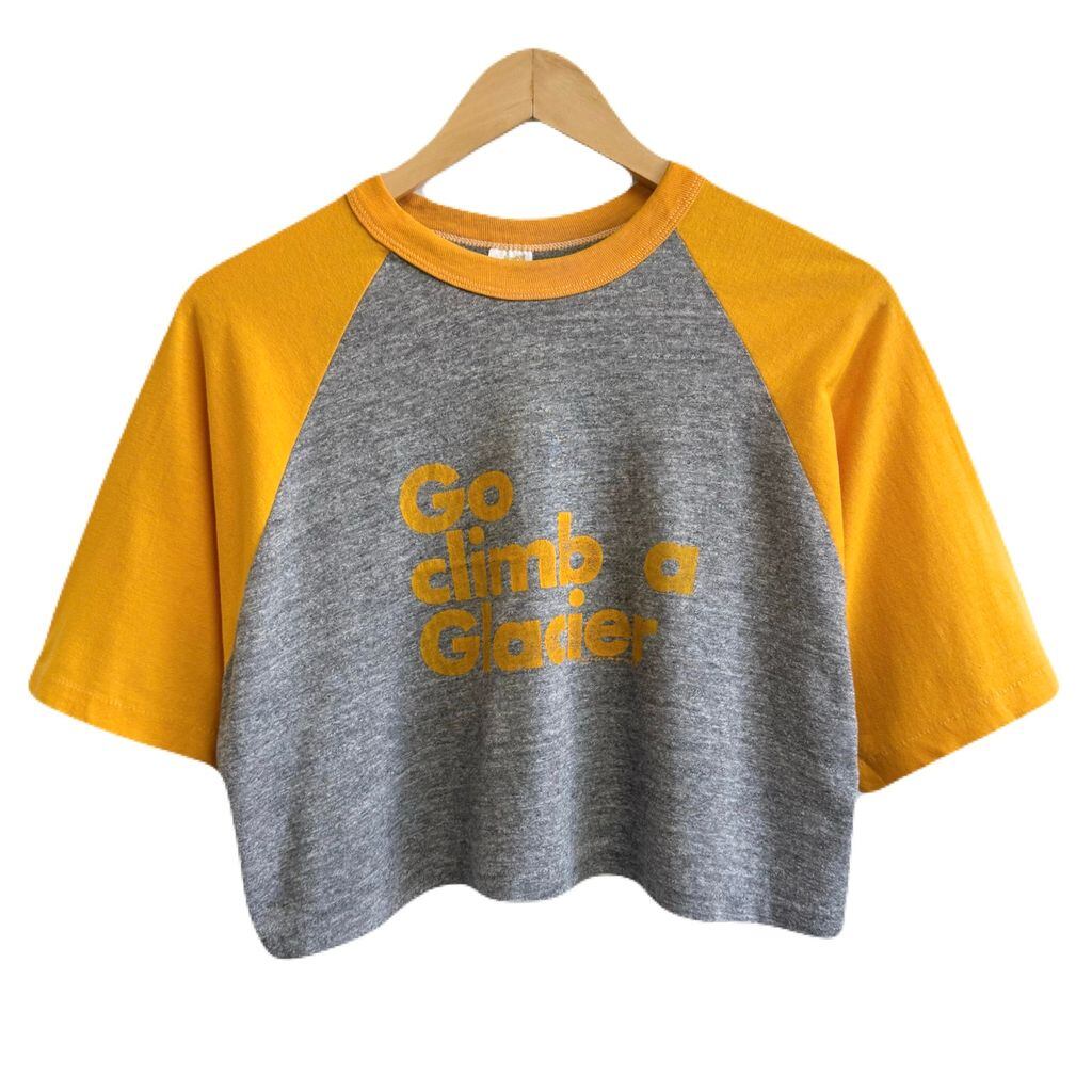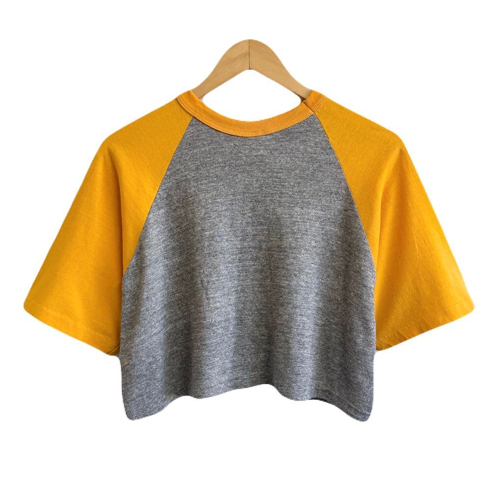 70's〜 vintage ビンテージ USA製 Sportswear ショート丈 クロップド ラグランスリーブ シングルステッチ 半袖Tシャツ やまぶきいろ×グレー XLサイズ No.P356