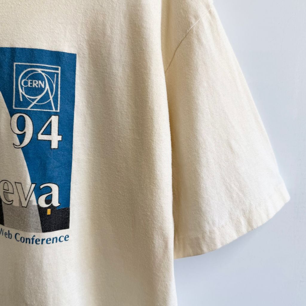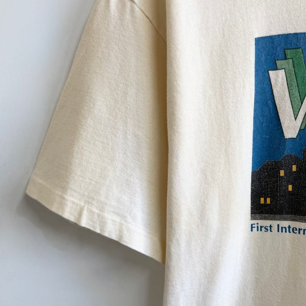 90's vintage ビンテージ USA製 Hanes ヘインズ Geneva 街並み 噴水 シングルステッチ 半袖Tシャツ アイボリー Lサイズ No.P361