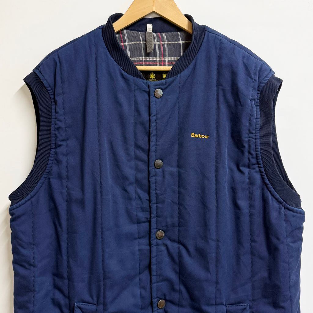 90's vintage ビンテージ EURO ユーロ UK Barbour バブアー 中綿ベスト 裏地チェック柄 スナップボタン 青 ブルー 紺 ネイビー XLサイズ No.P389