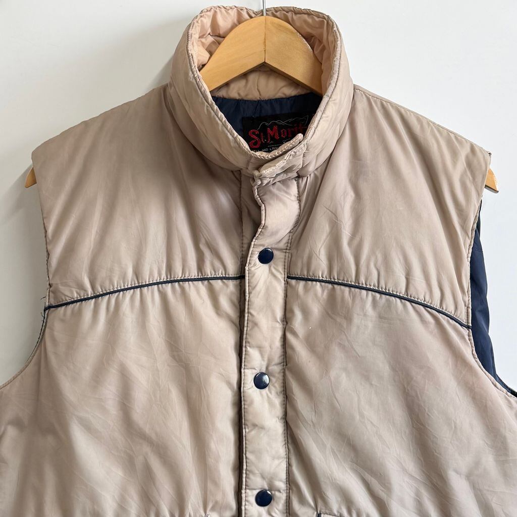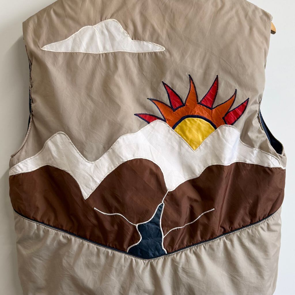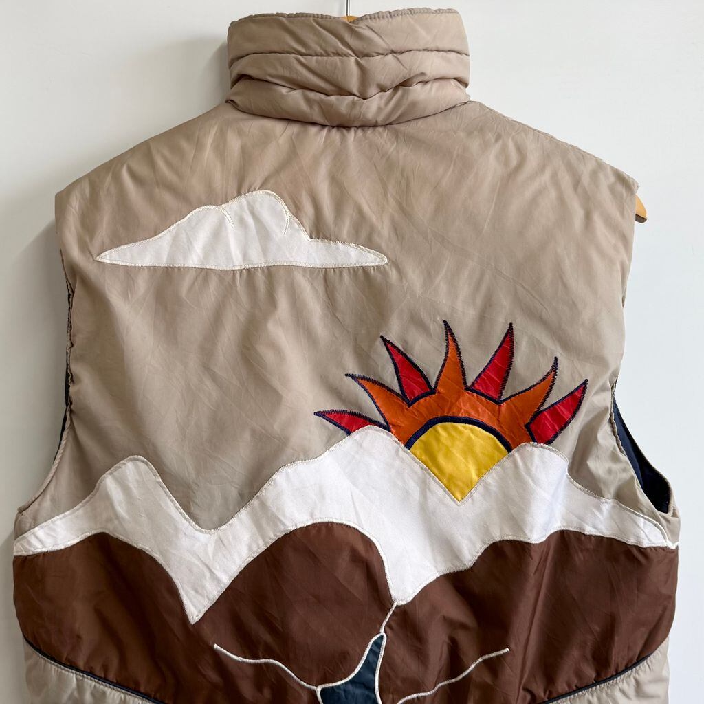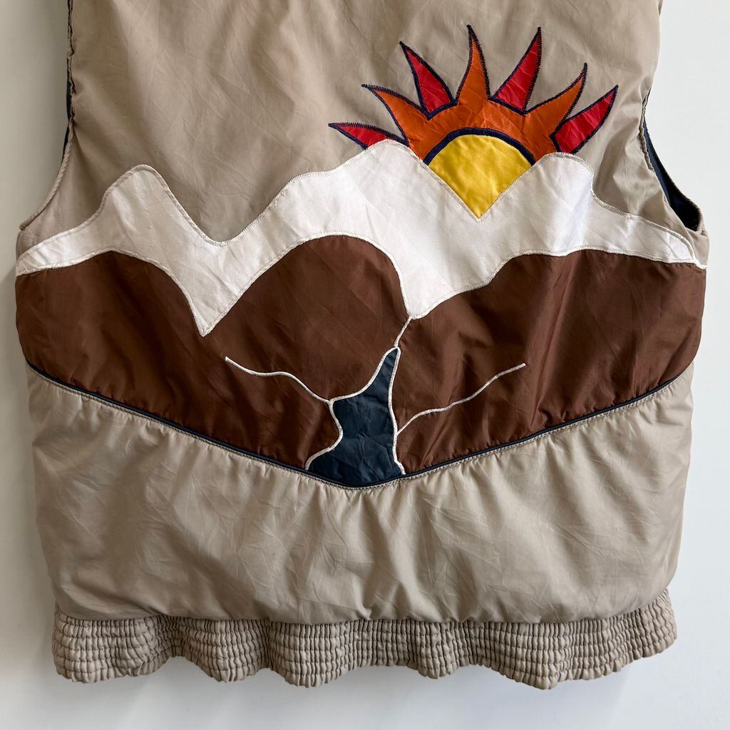 70's〜 vintage ビンテージ St.Moritz ダウンベスト パッチワーク 山 太陽 雲 スナップボタン ベージュ No.P472