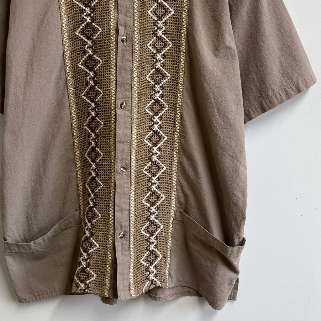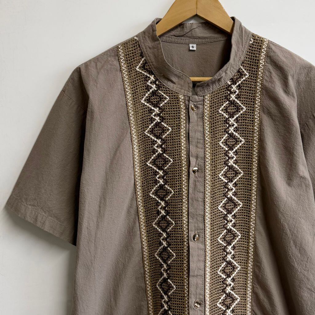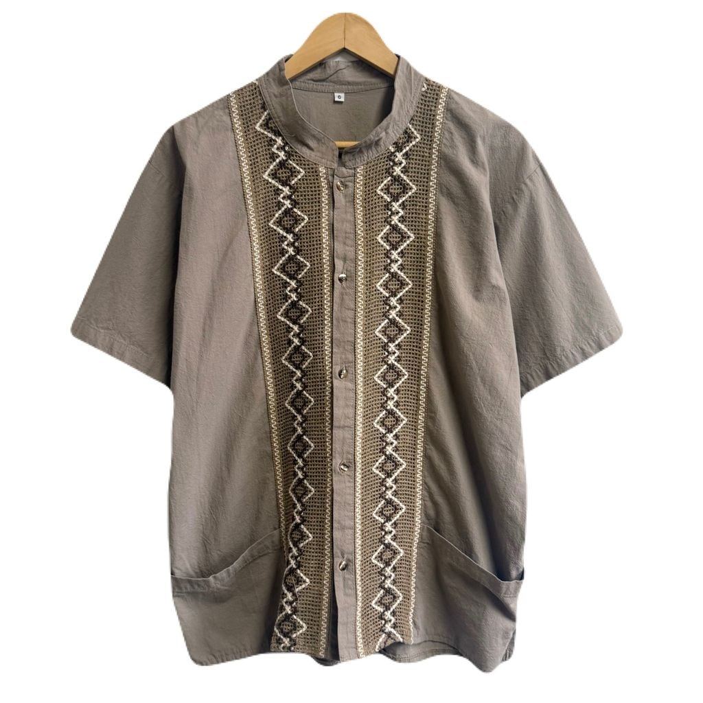キューバシャツ バンドカラー 刺繍 半袖シャツ グレージュ No.P517