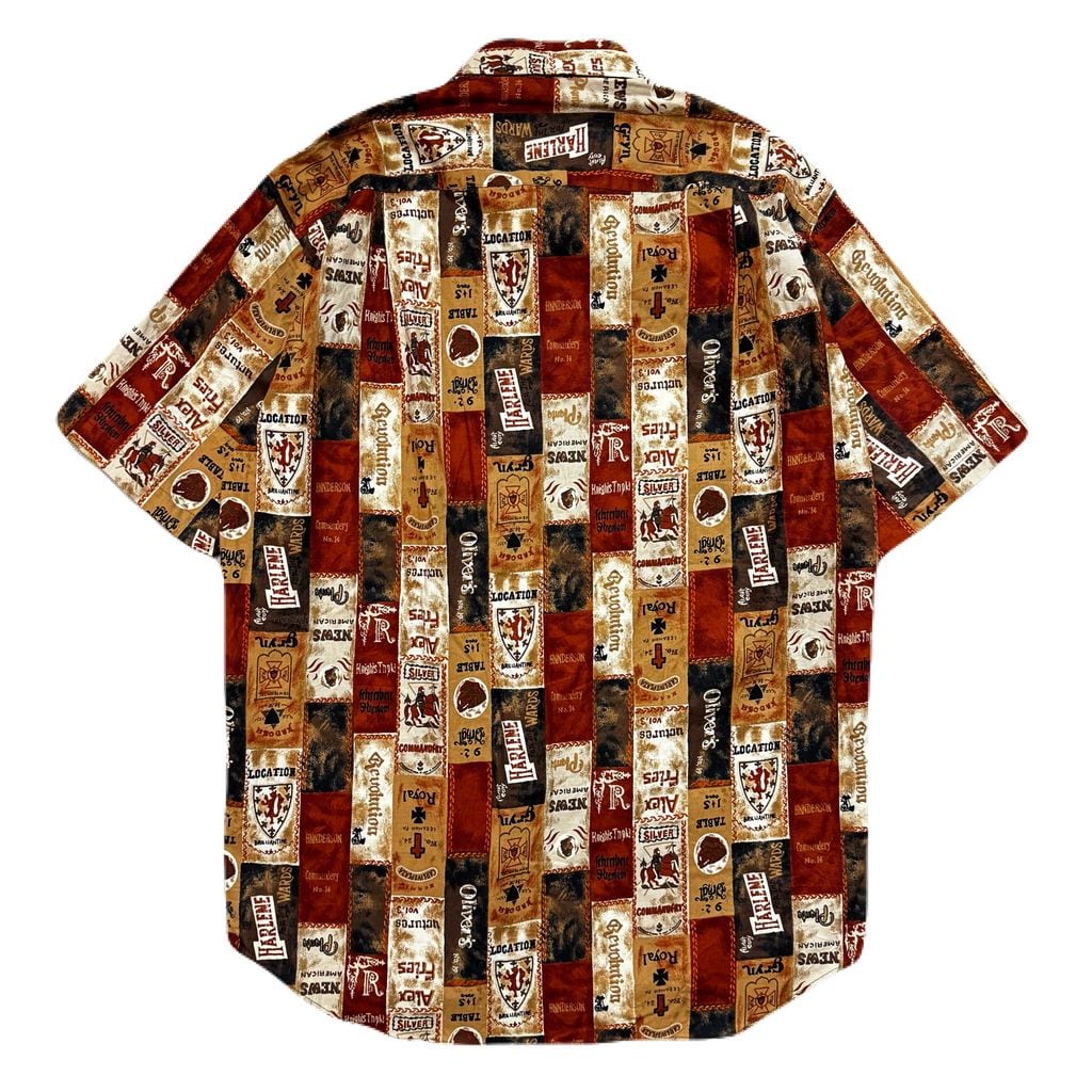 TIME BELL レトロ ラベル 総柄 柄シャツ ボタンダウン 半袖シャツ ポケット付き ブラウン Lサイズ No.EA381
