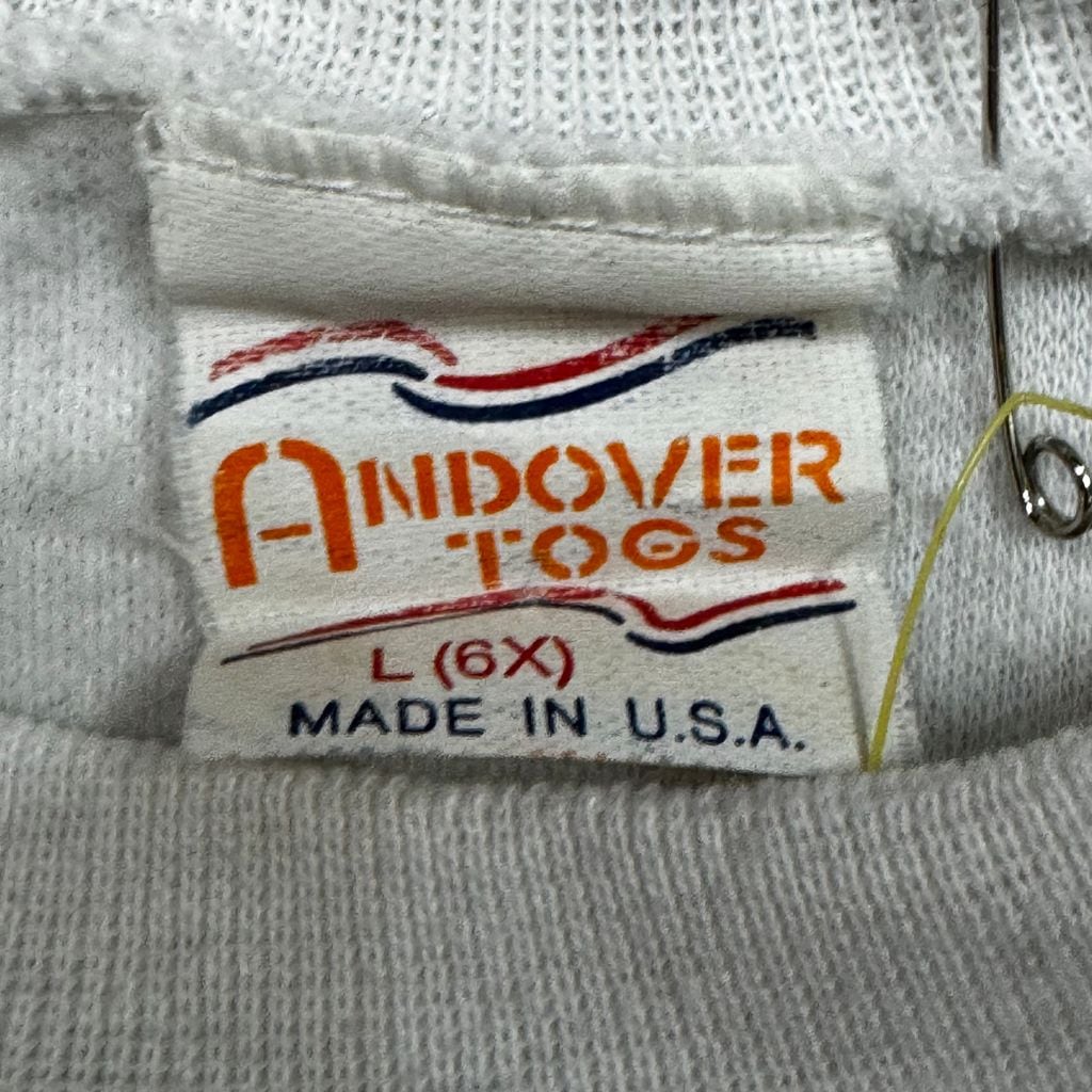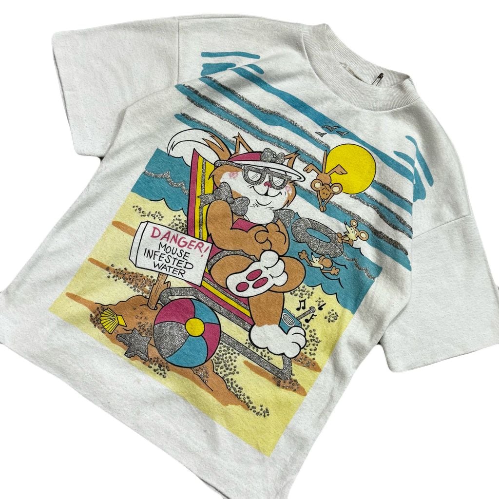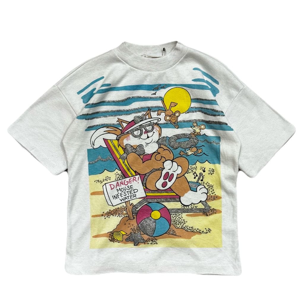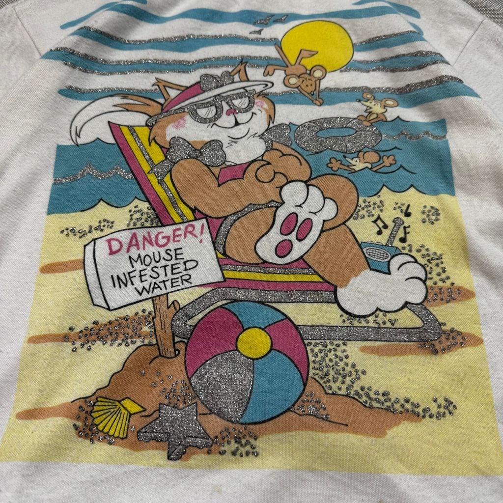 USA製 ANDOVER TOGS DANGER! MOUSE INFESTED WATER vintage kids アンドヴァートグス キッズ 猫 ネズミ ビーチ ラメプリント Tシャツ 白 サイズ 6x No.EA396