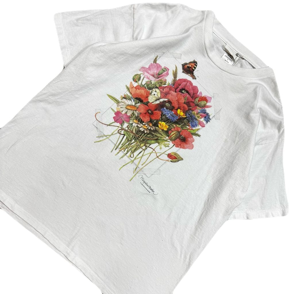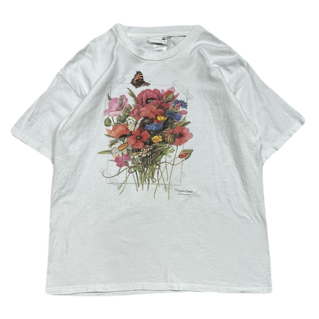 USA製 90s Marjolein Bastin マロリンバスティン 蝶 植物 フラワー フォト アート Tシャツ 白 Lサイズ No.EA387