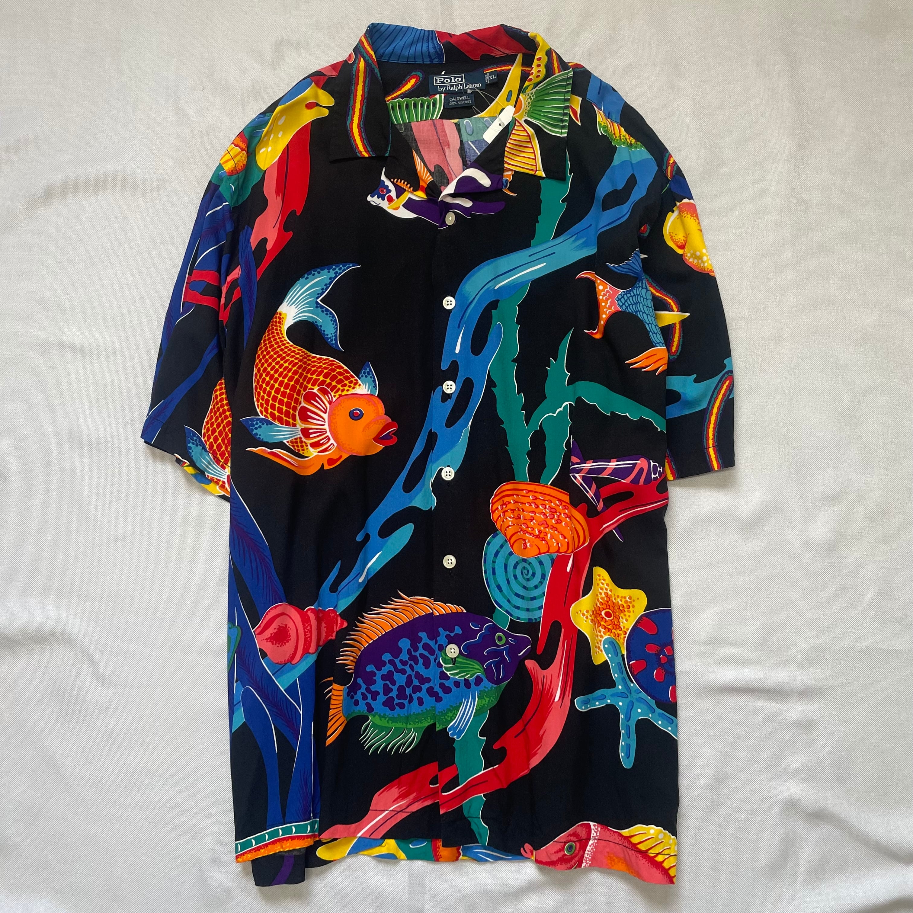 90's Ralph Lauren ラルフローレン レーヨンシャツ 半袖シャツ オープンカラー 開襟シャツ 黒 魚 XLサイズ No.F028