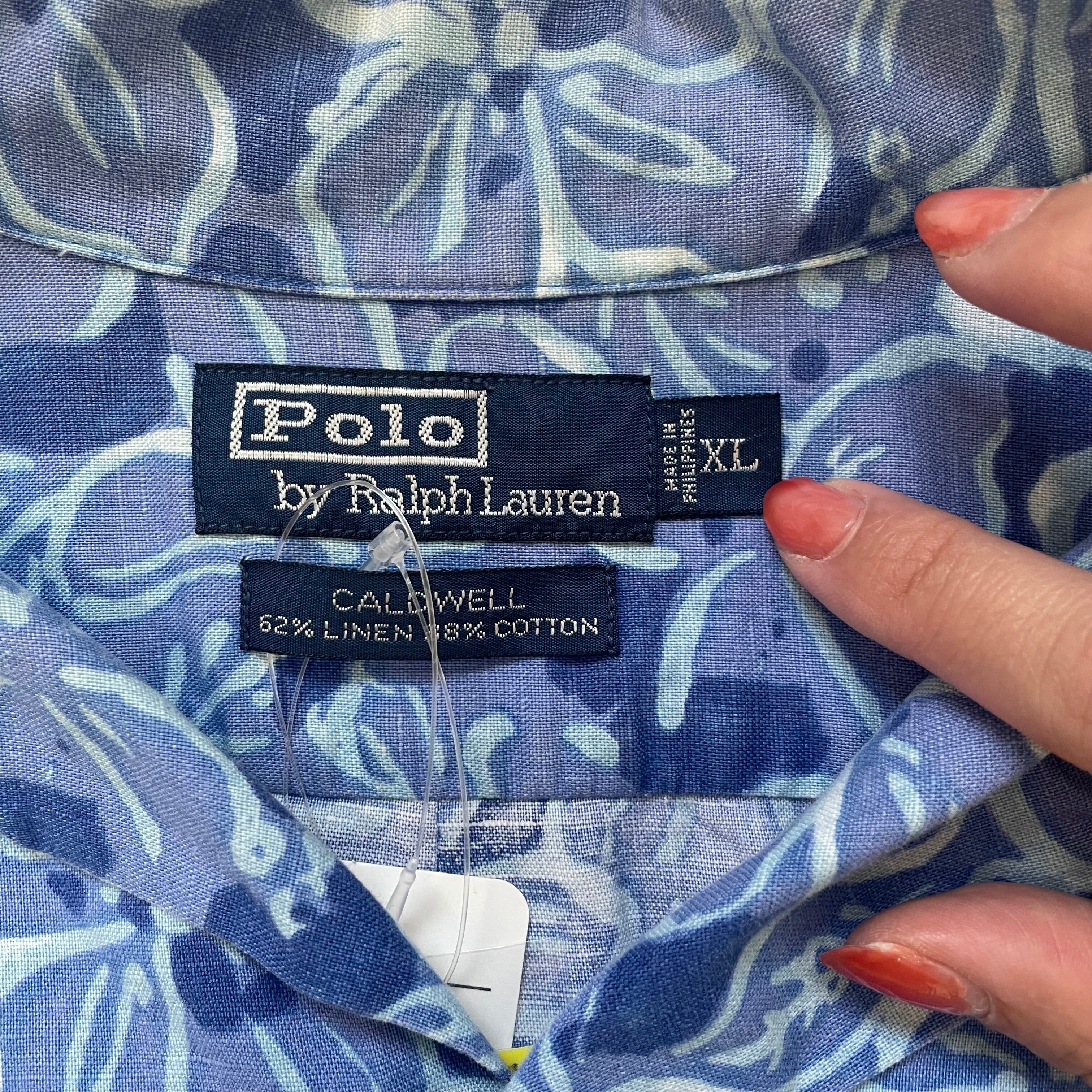 90's Ralph Lauren ラルフローレン アロハシャツ 半袖シャツ オープンカラー 開襟シャツ ハイビスカス 水色 リネン×コットン XLサイズ No.F029