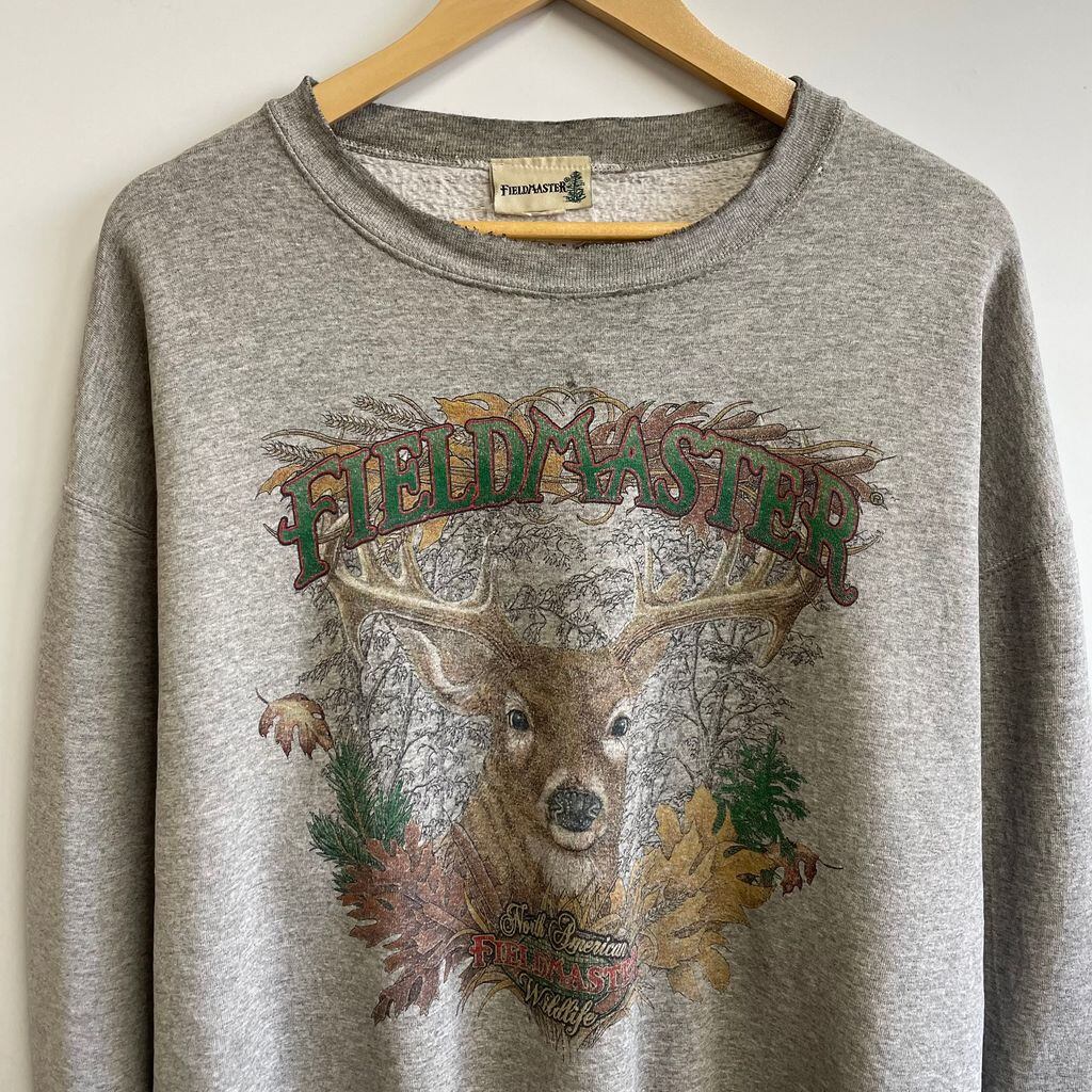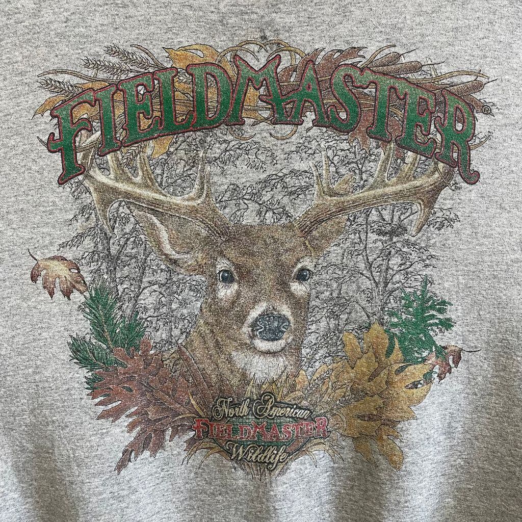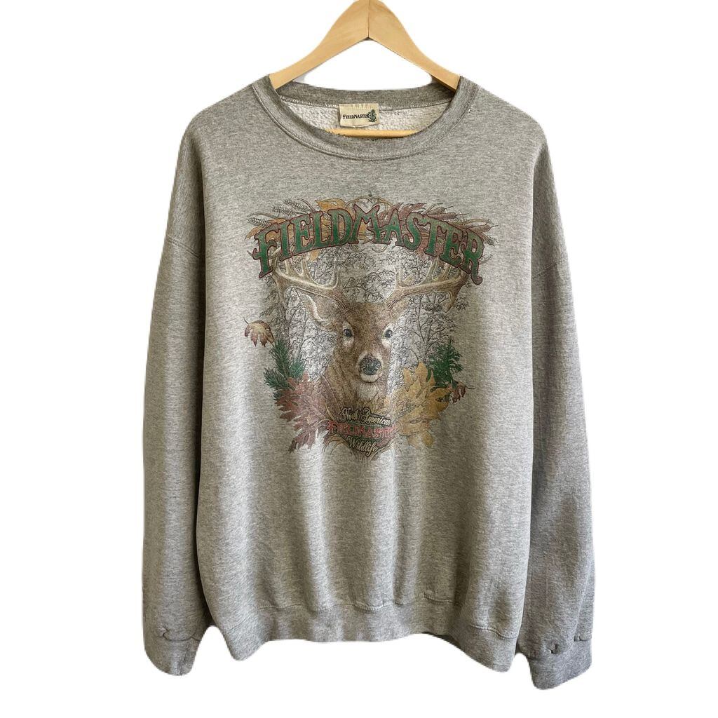 FIELD MASTER トレーナー スウェット アニマルプリント 鹿 トナカイ 落ち葉 木 グレー XLサイズ No.U123
