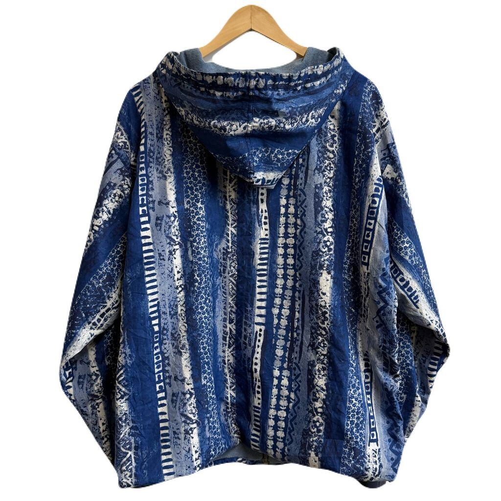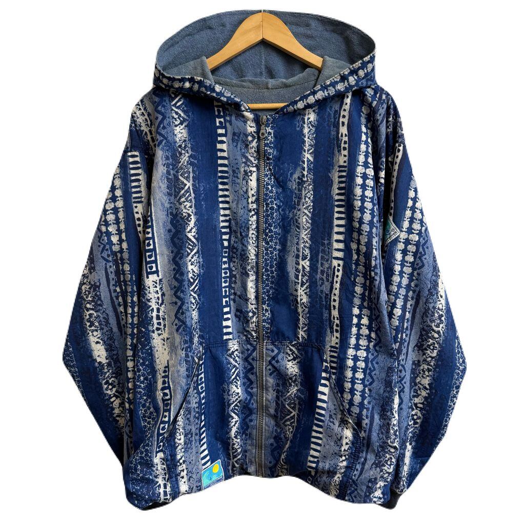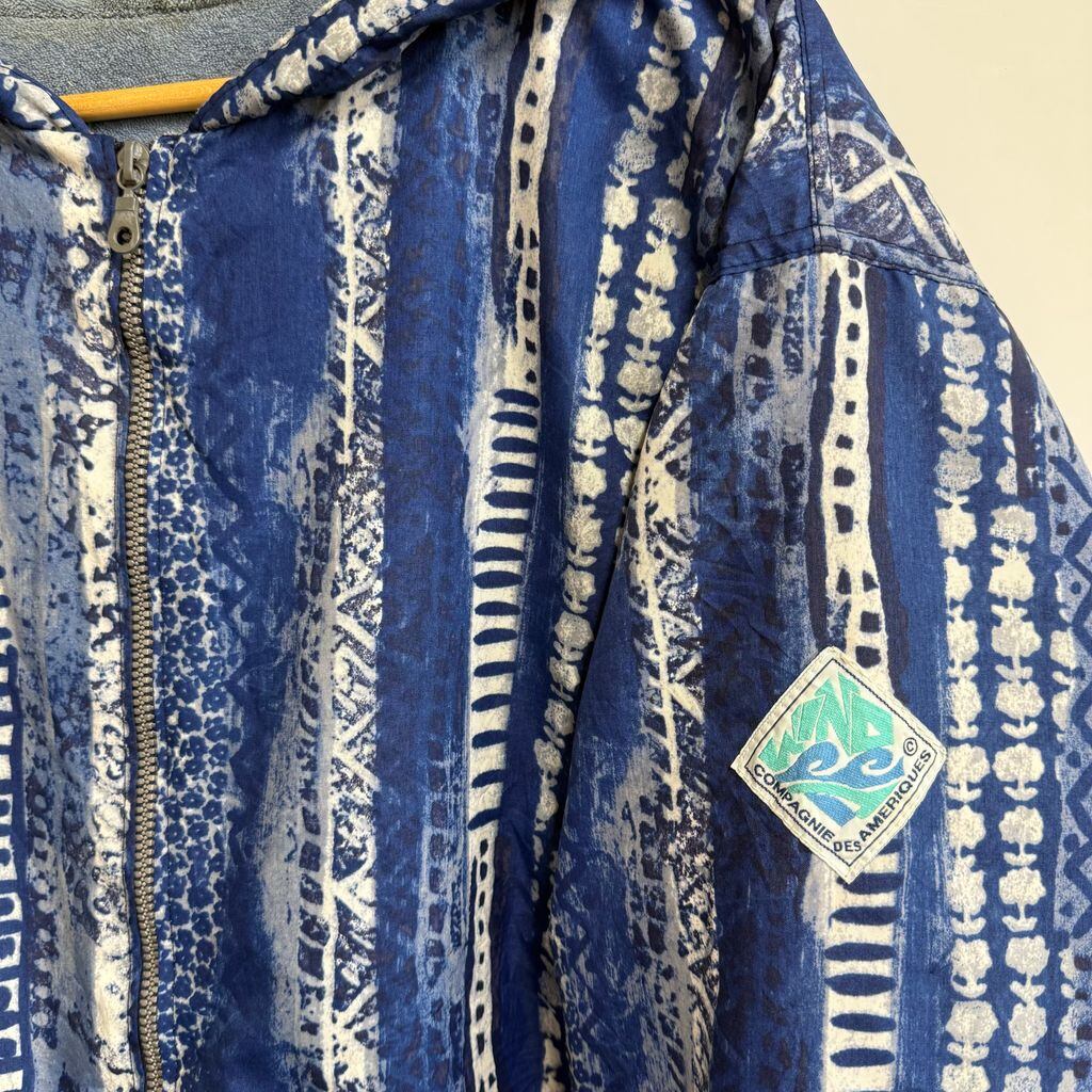 〜90's フランス製 COMPAGNIE DES AMERIQUES ブルゾン フードジャケット 柄ジャケット 総柄 パイル裏地 フルジップ ポケット付き 青×白 No.J146